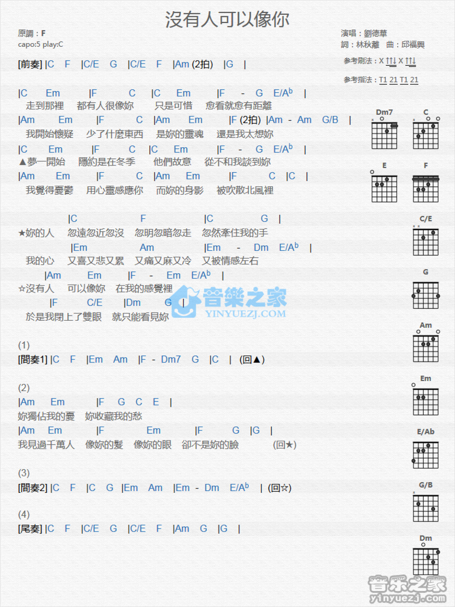 曲谱介绍: C调版 刘德华《没有人可以像你》吉他和弦弹唱谱