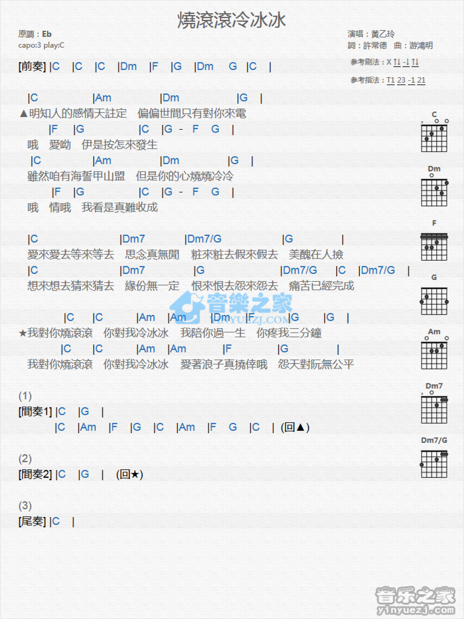 曲谱介绍: C调版 黄乙玲《烧滚滚冷冰冰》吉他和弦弹唱谱