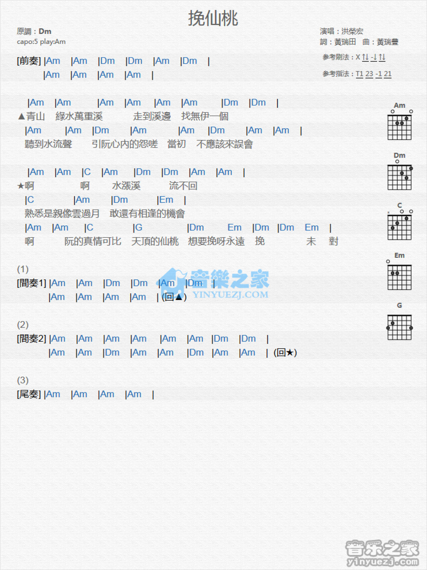 曲谱介绍: Am调版 洪荣宏《挽仙桃》吉他和弦弹唱谱
