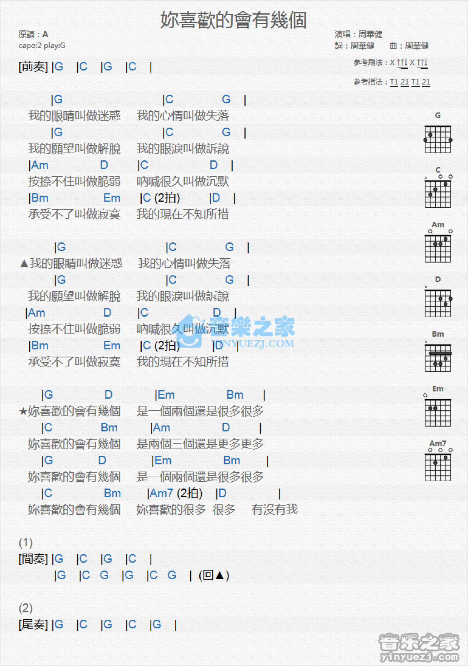 曲谱介绍: G调版 周华健《你喜欢的会有几个》吉他和弦弹唱谱