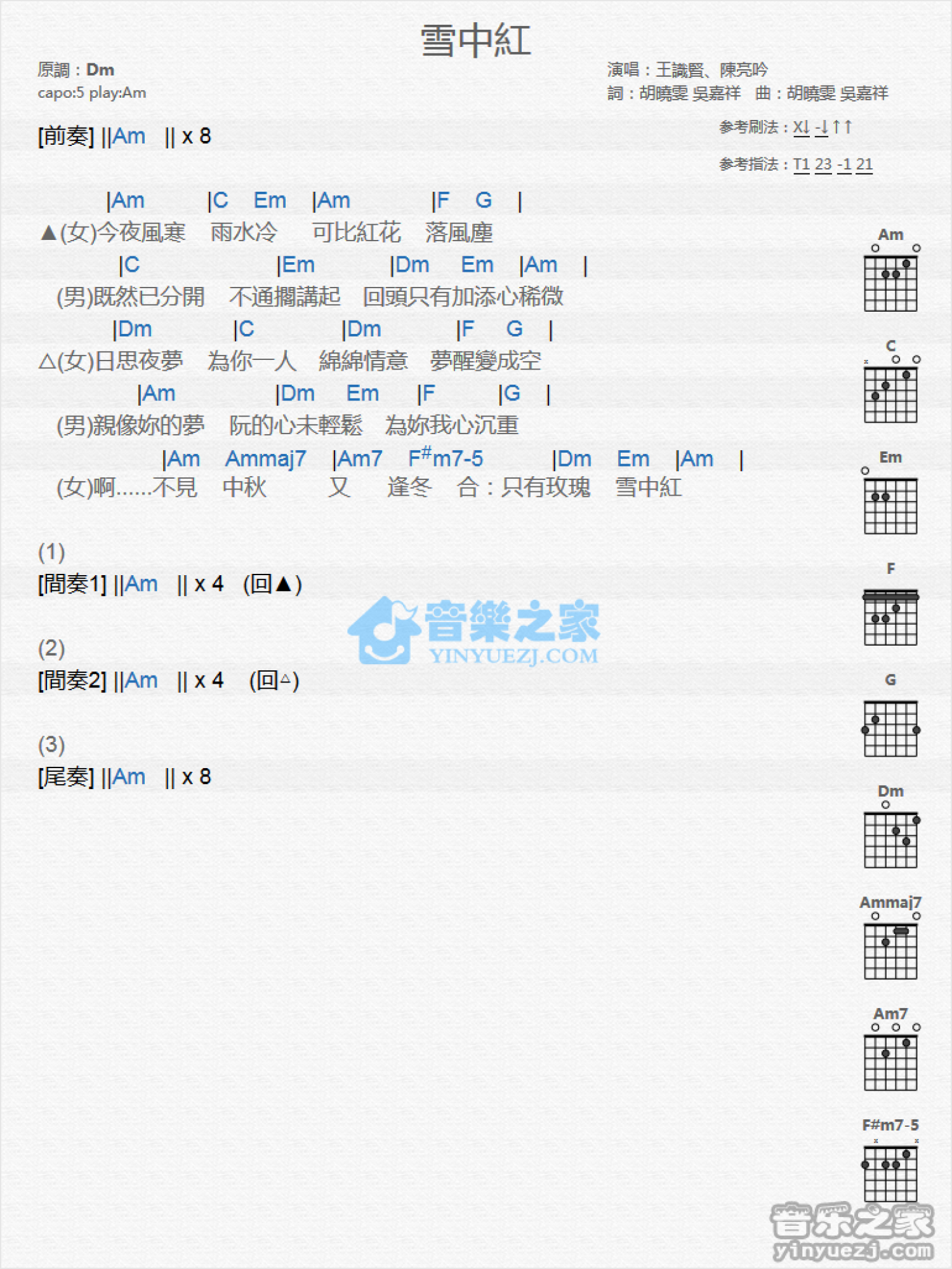 曲谱介绍: Am调版 王识贤/陈亮吟《雪中红》吉他和弦弹唱谱