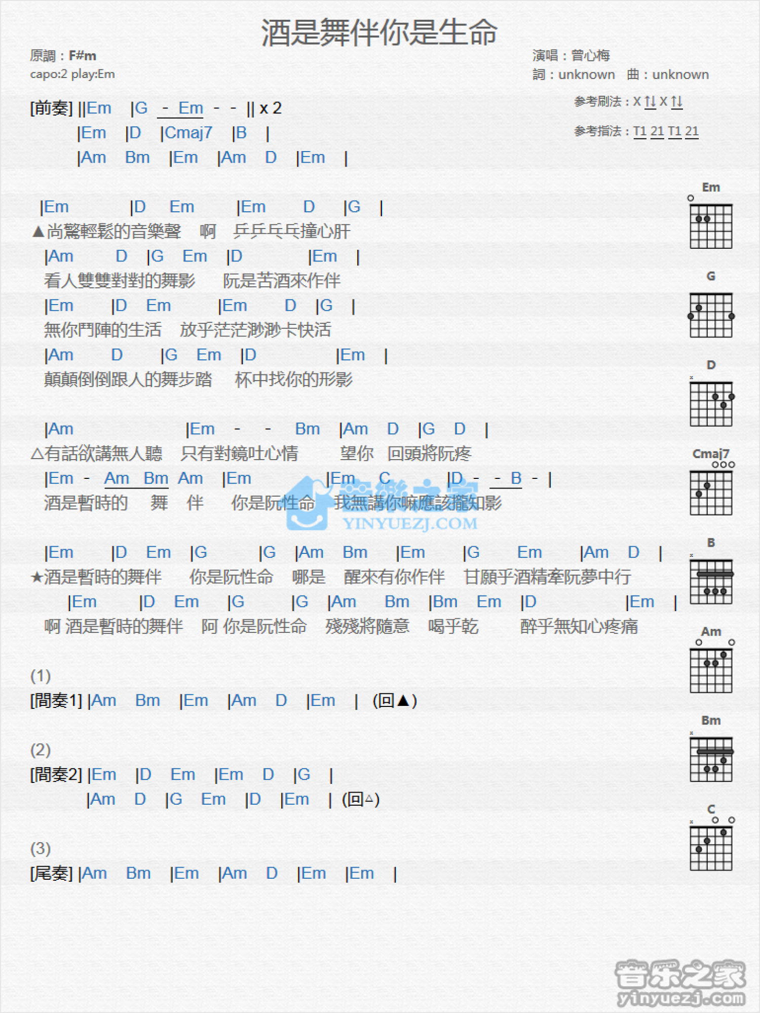 曲谱介绍: Em调版 曾心梅《酒是舞伴你是生命》吉他和弦弹唱谱