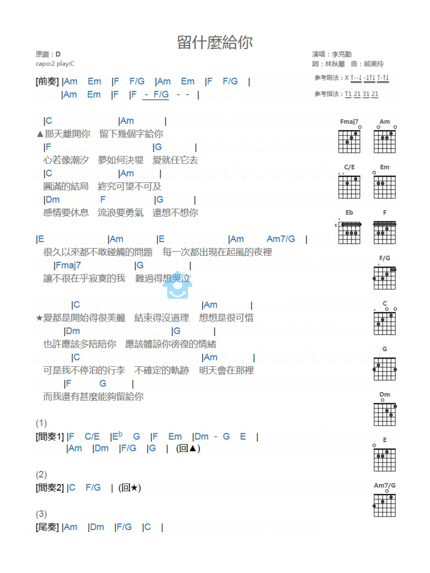 曲谱介绍: C调版 李克勤《留什么给你》吉他和弦弹唱谱