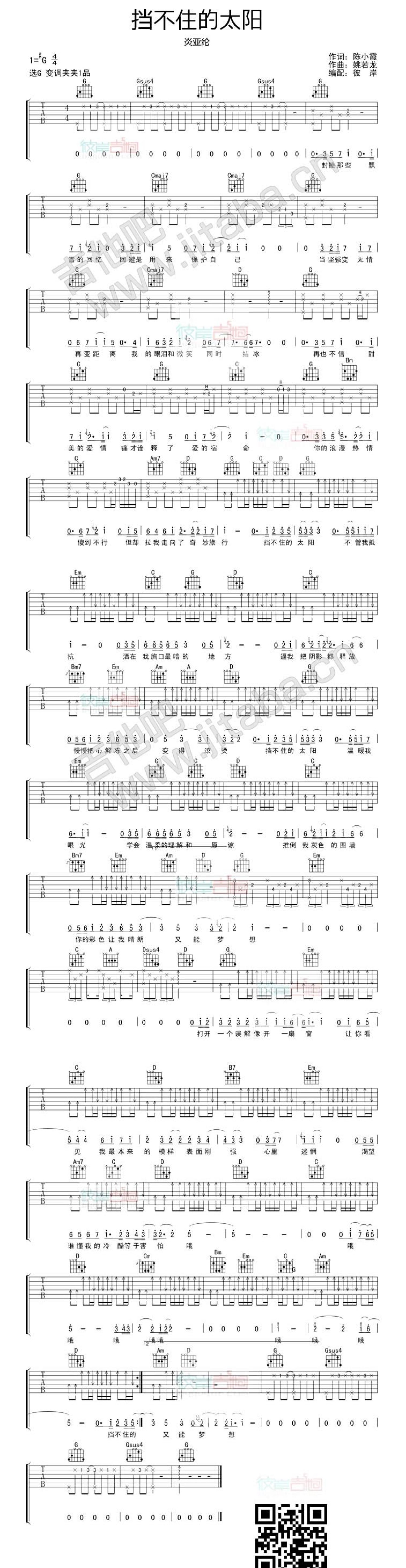 曲谱介绍: 彼岸G调版《挡不住的太阳》吉他弹唱六线谱