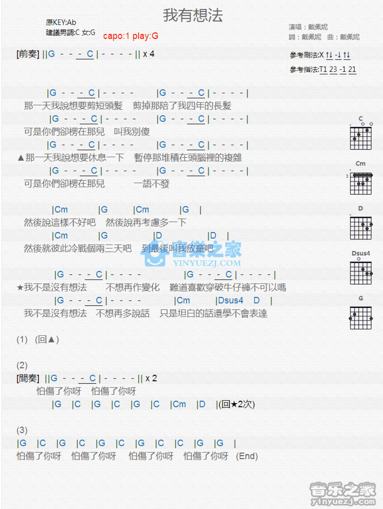 曲谱介绍: G调版 戴佩妮《我有想法》吉他和弦弹唱谱