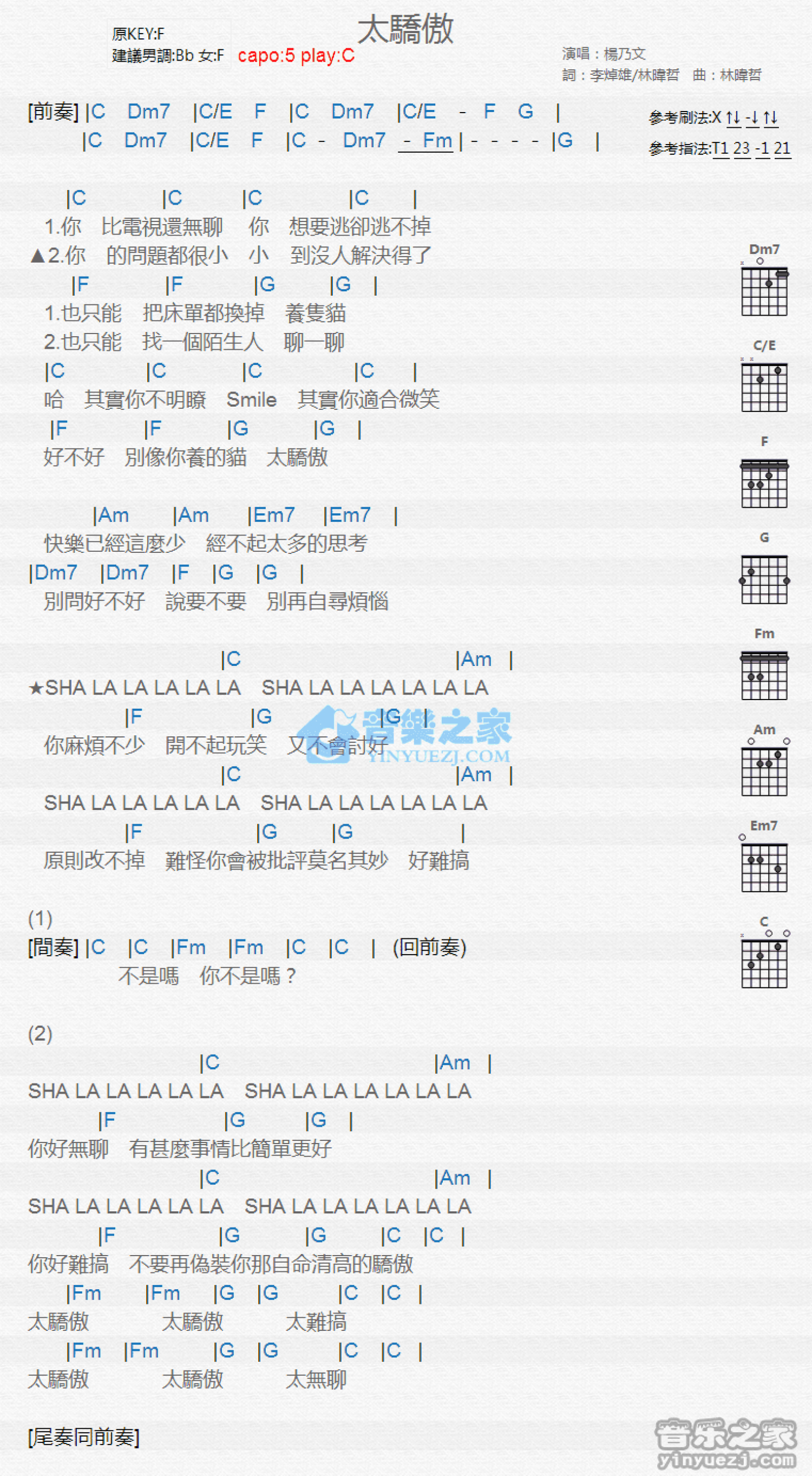太骄傲吉他谱 - 杨乃文 - C调吉他弹唱谱 - 和弦谱