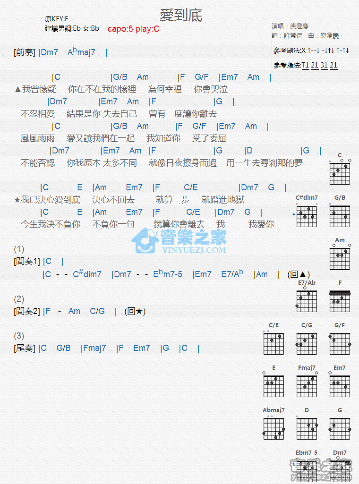曲谱介绍: C调版 庾澄庆《爱到底》吉他和弦弹唱谱
