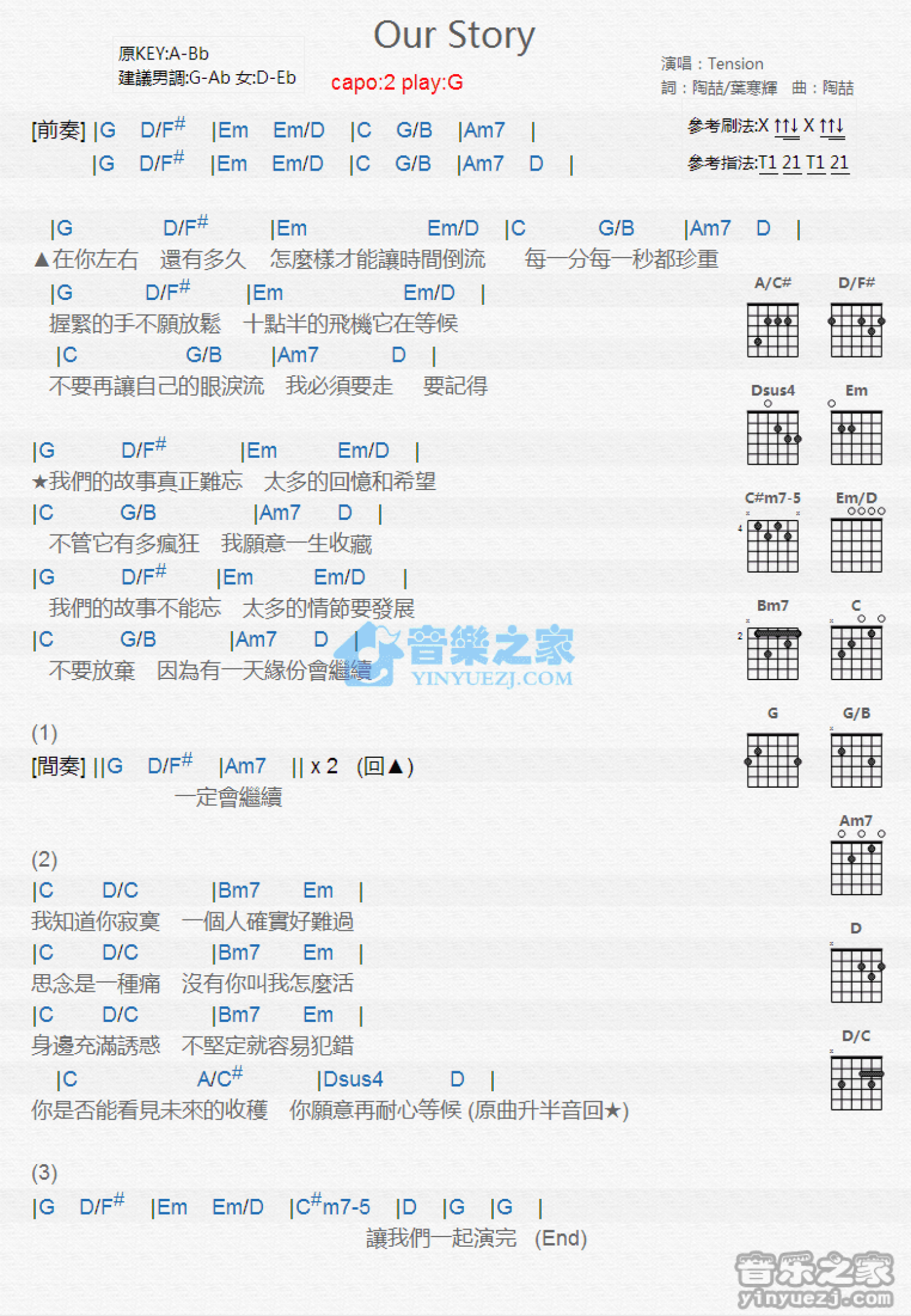 曲谱介绍: G调版 Tension《Our Story》吉他和弦弹唱谱