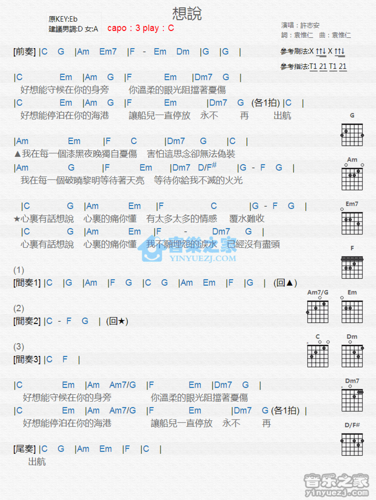 曲谱介绍: C调版 许志安《想说》吉他和弦弹唱谱