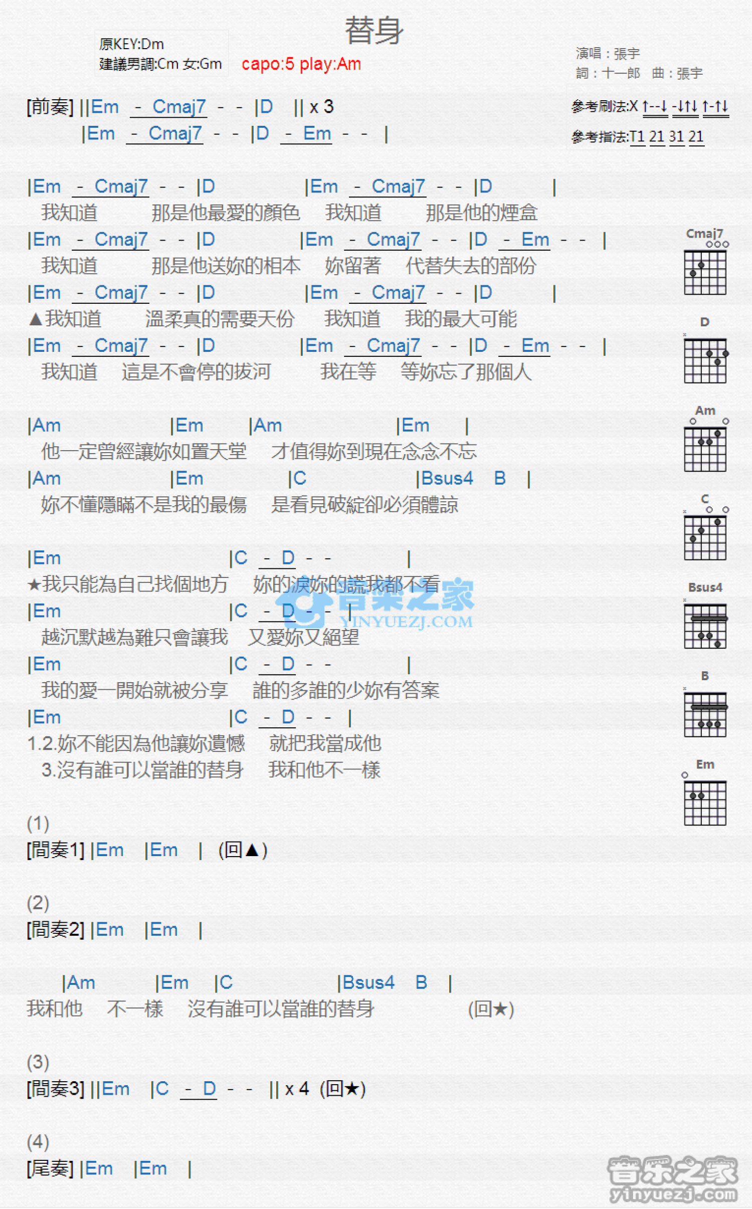 曲谱介绍: Am调版 张宇《替身》吉他和弦弹唱谱