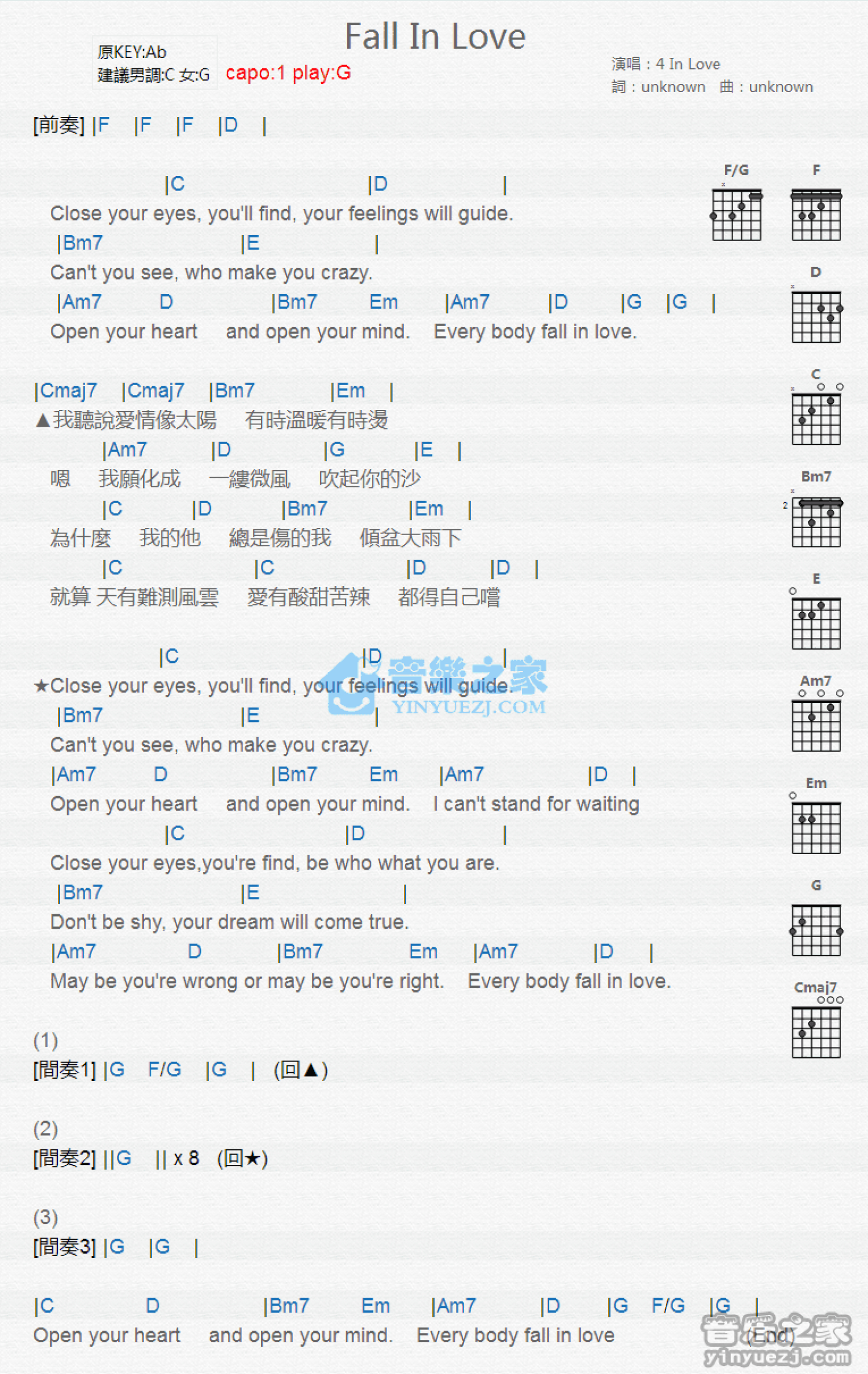 曲谱介绍: G调版 4 In Love《Fall In Love》吉他和弦弹唱谱