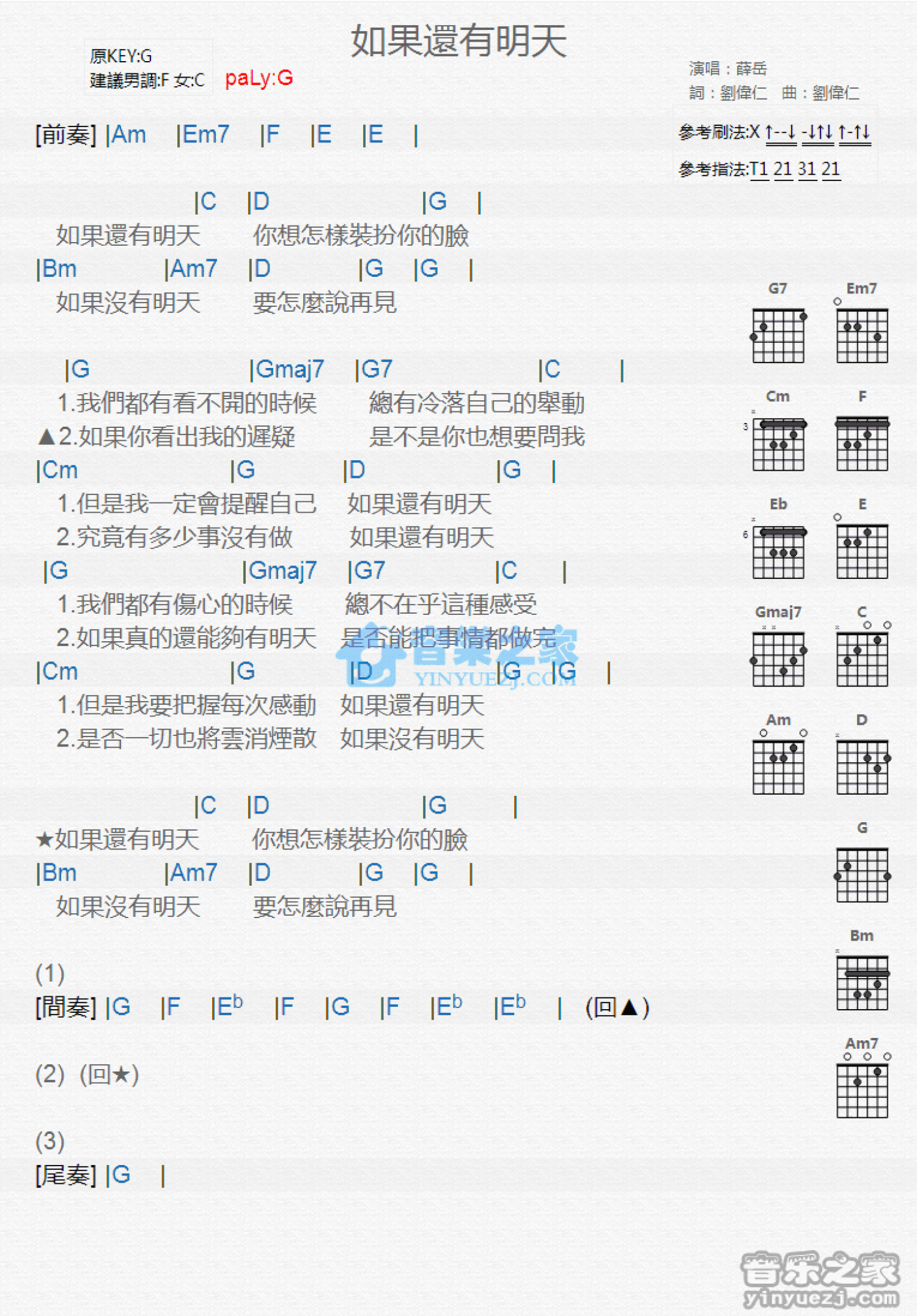 曲谱介绍: G调版 薛岳《如果还有明天》吉他和弦弹唱谱