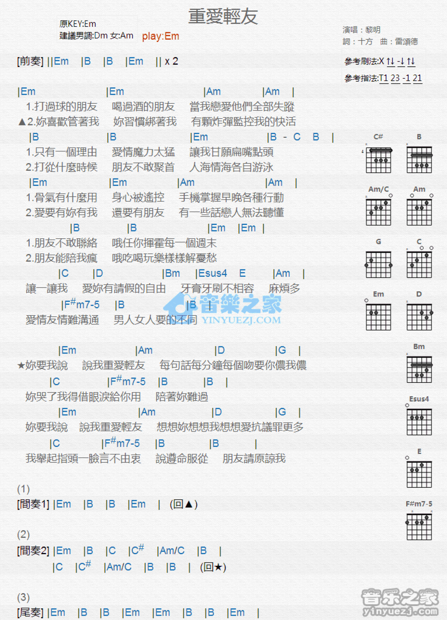 曲谱介绍: Em调版 黎明《重爱轻友》吉他和弦弹唱谱