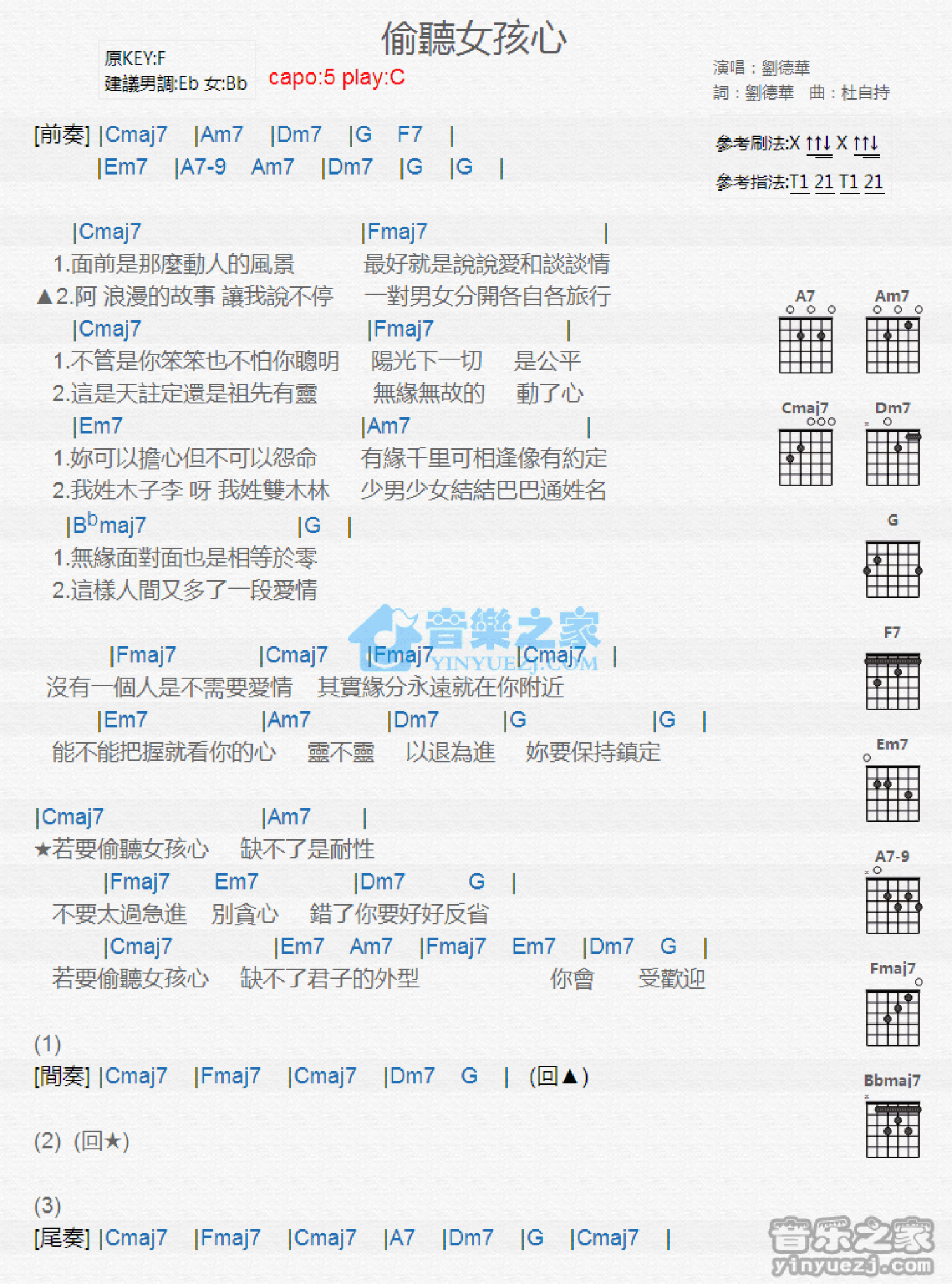 曲谱介绍: C调版 刘德华《偷听女孩心》吉他和弦弹唱谱
