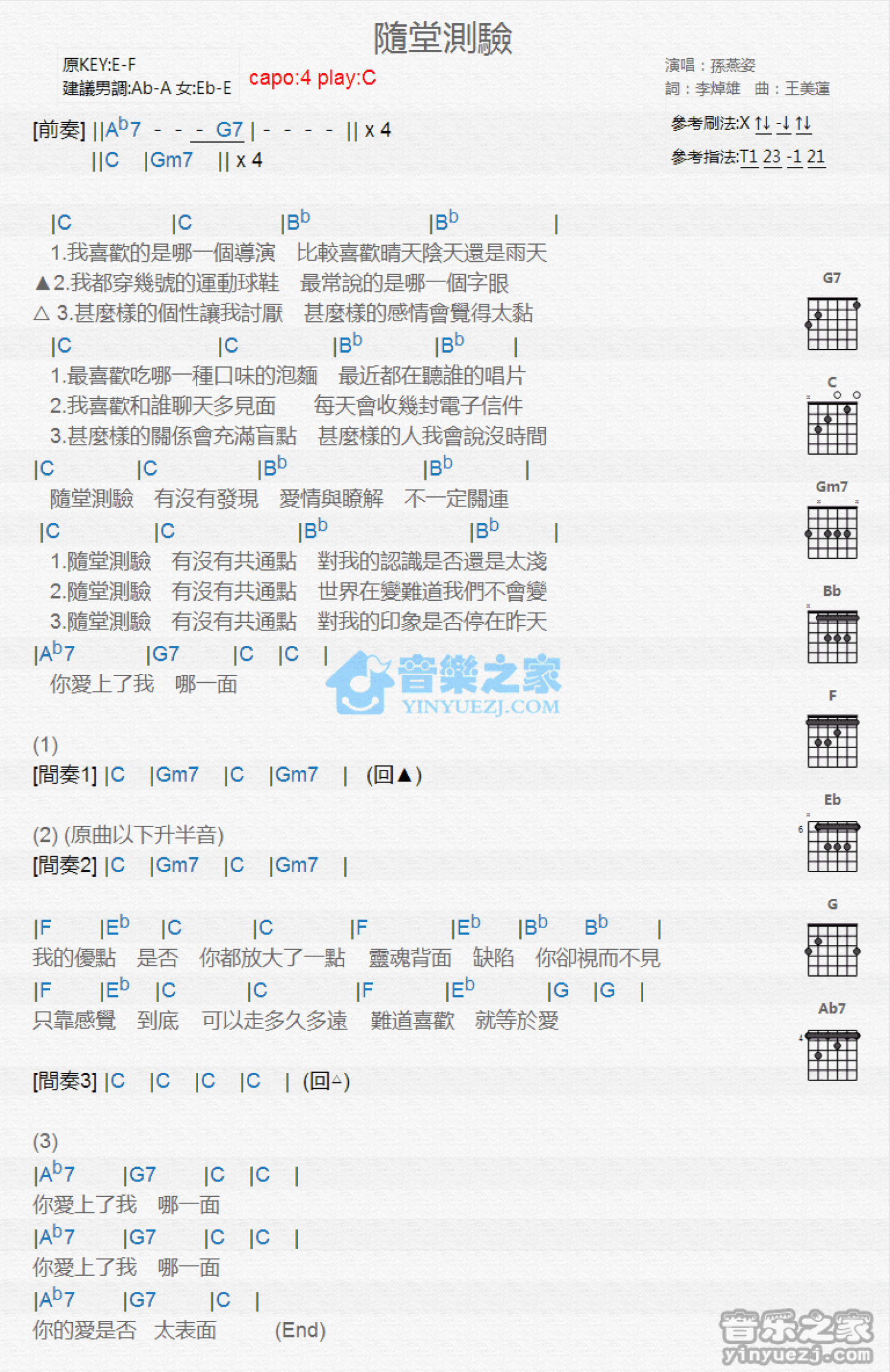 曲谱介绍: C调版 孙燕姿《随堂测验》吉他和弦弹唱谱