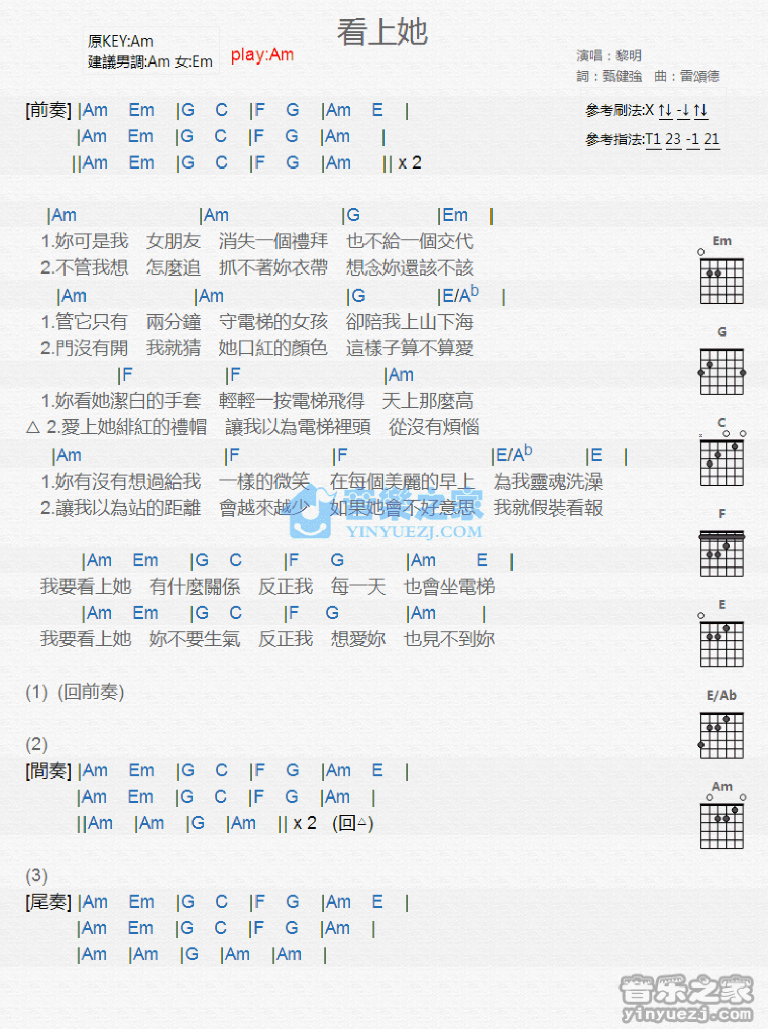 曲谱介绍: Am调版 黎明《看上她》吉他和弦弹唱谱