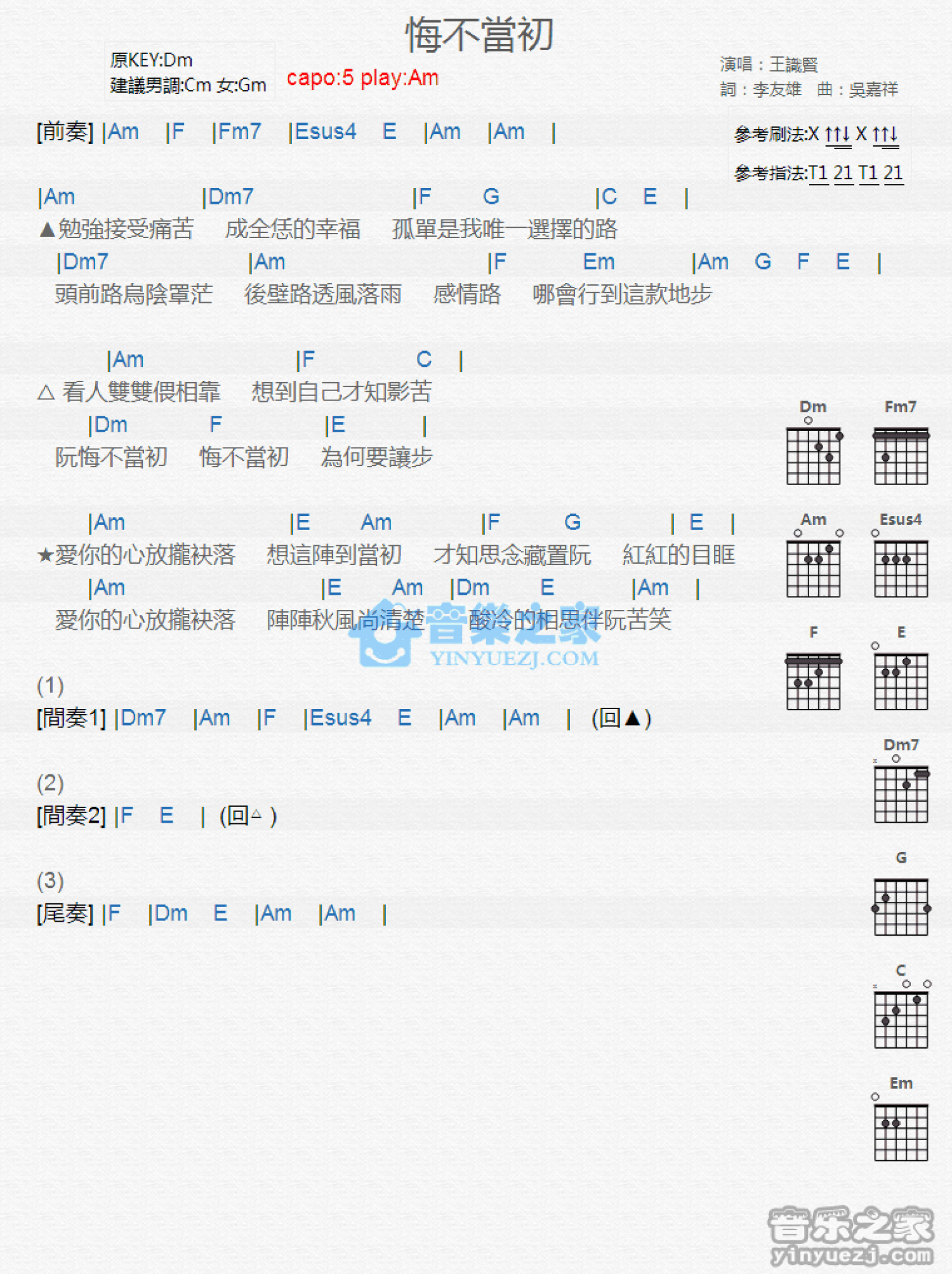 曲谱介绍: Am调版 王识贤《悔不当初》吉他和弦弹唱谱