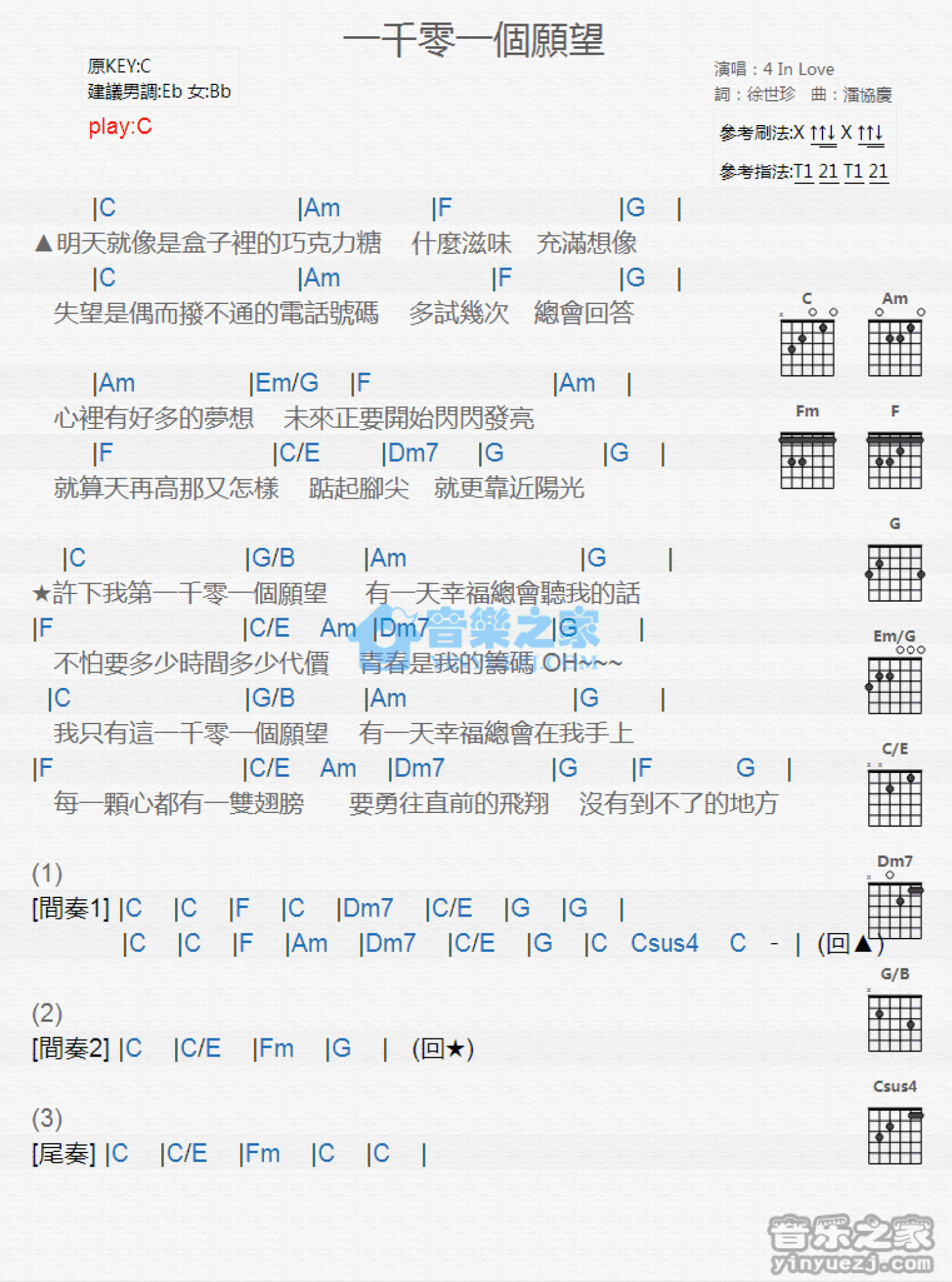 一千零一个愿望吉他谱 - 4InLove - C调吉他弹唱谱 - 和弦谱
