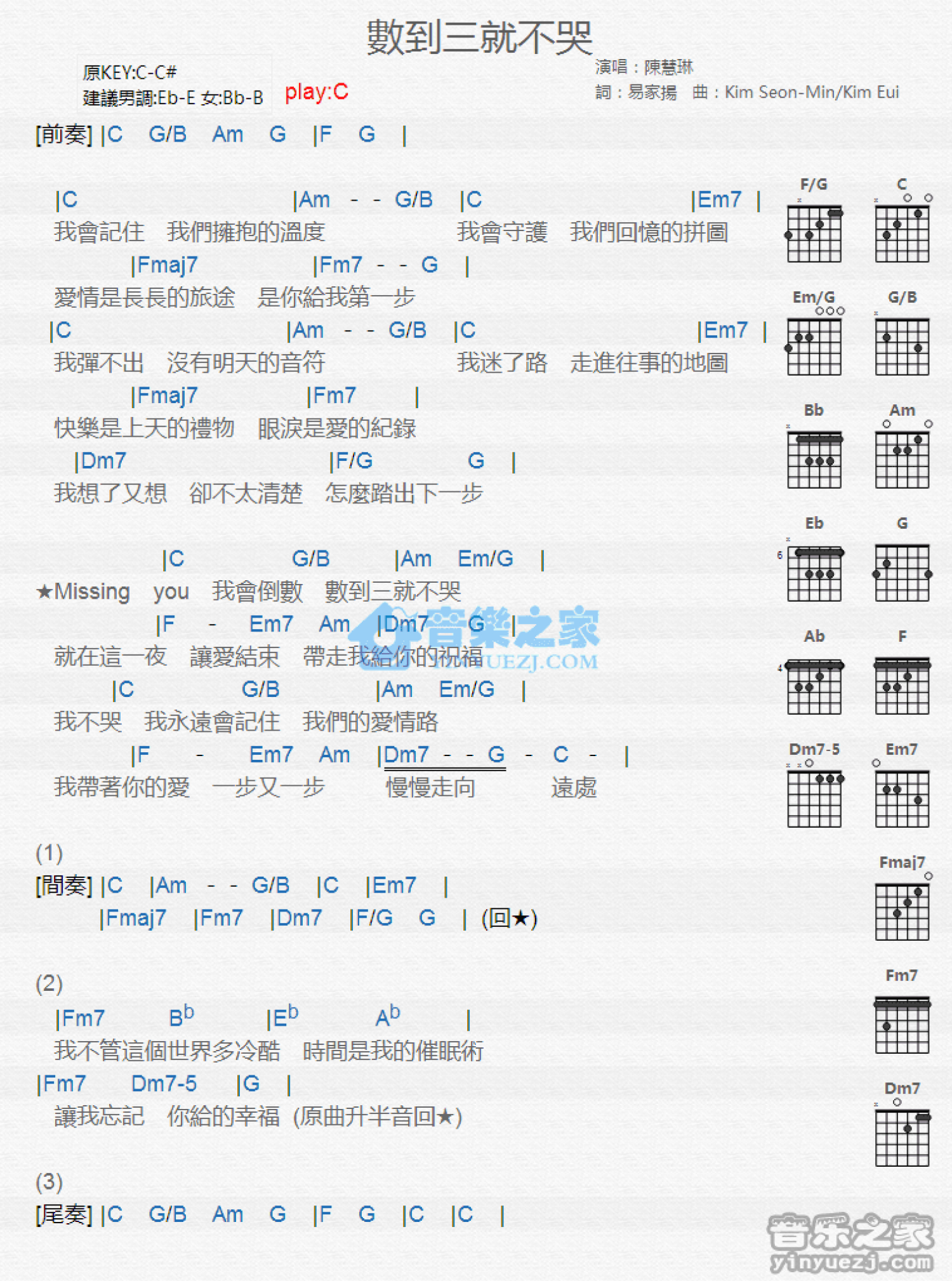 曲谱介绍: C调版 陈慧琳《数到三就不哭》吉他和弦弹唱谱