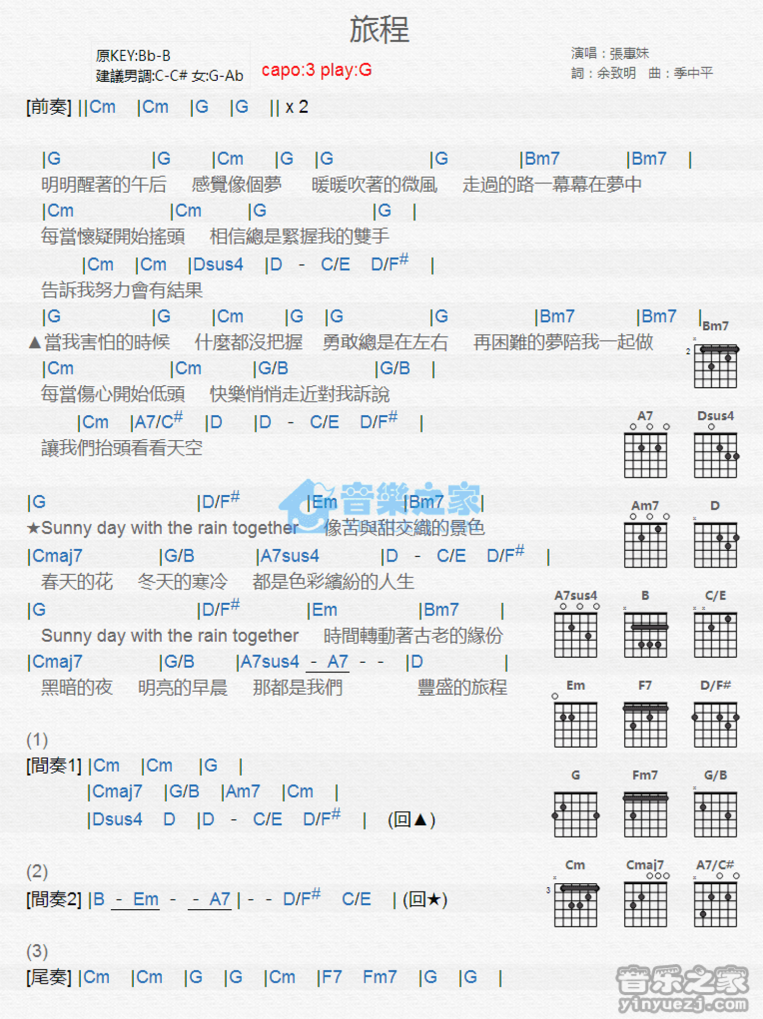 曲谱介绍: G调版 张惠妹《旅程》吉他和弦弹唱谱