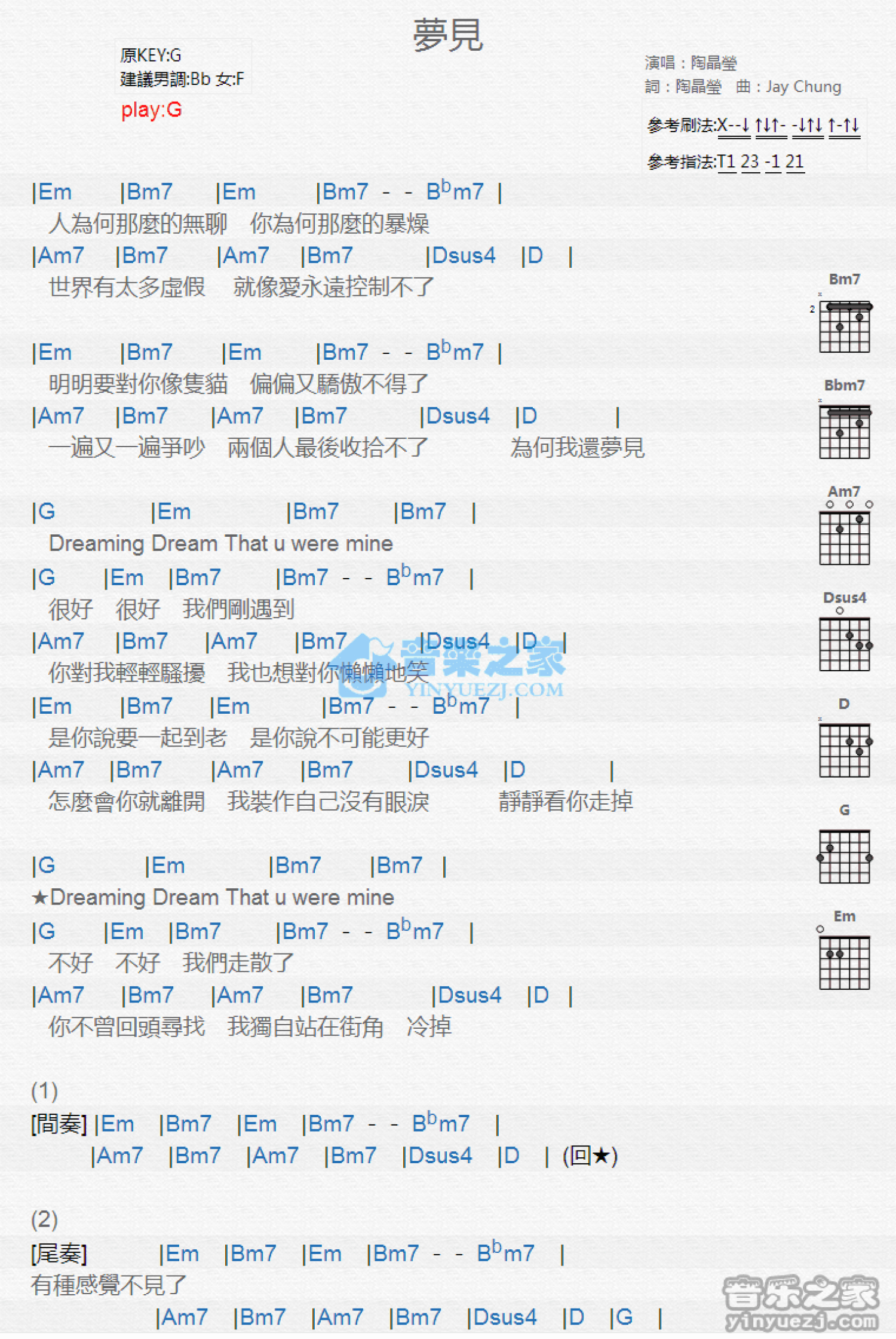 曲谱介绍: G调版 陶晶莹《梦见》吉他和弦弹唱谱