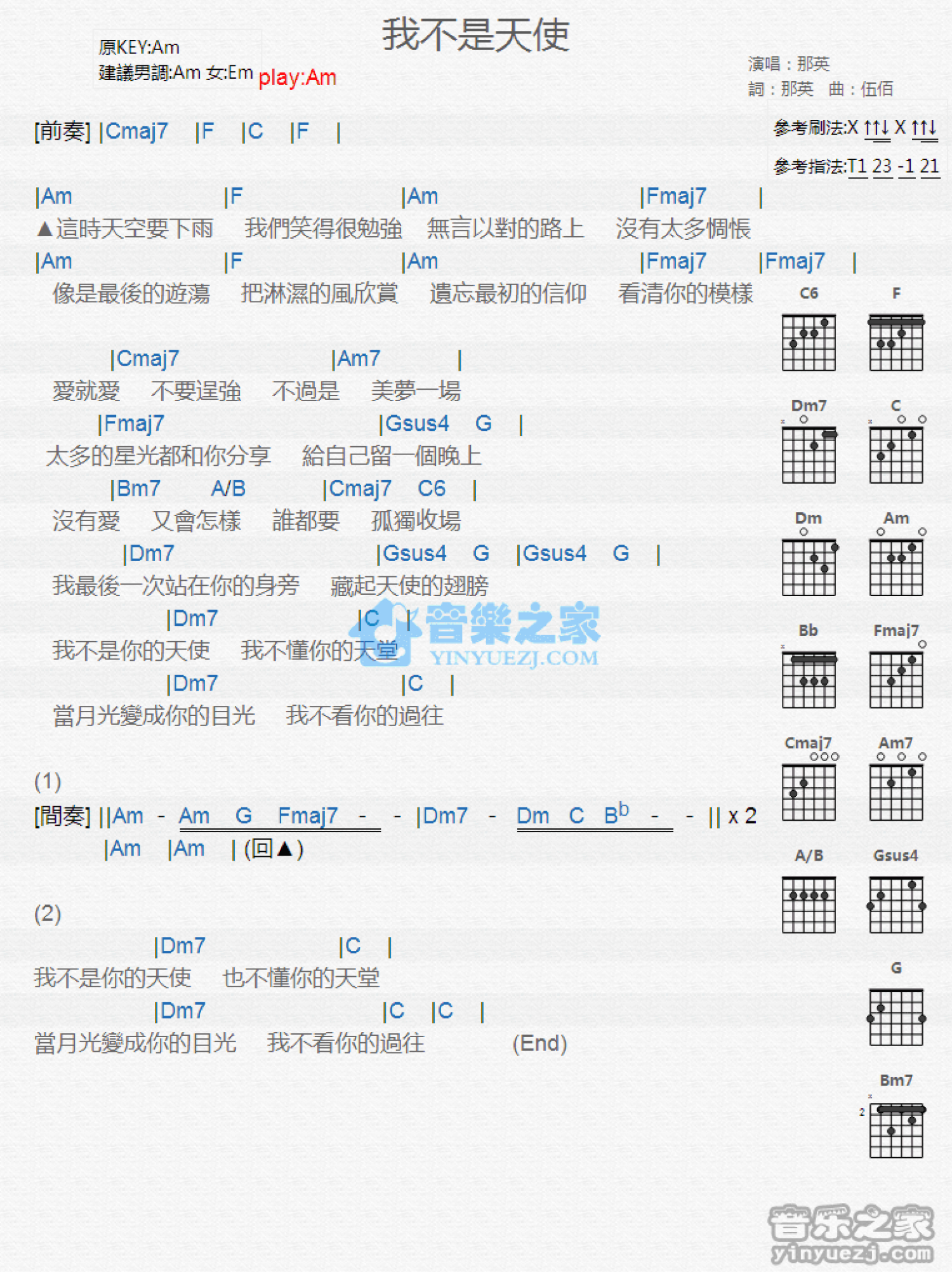 曲谱介绍: Am调版 那英《我不是天使》吉他和弦弹唱谱