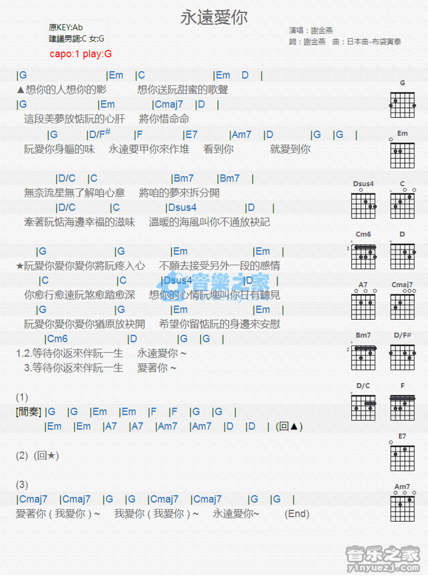 永远爱你吉他谱 - 谢金燕 - G调吉他弹唱谱 - 和弦谱