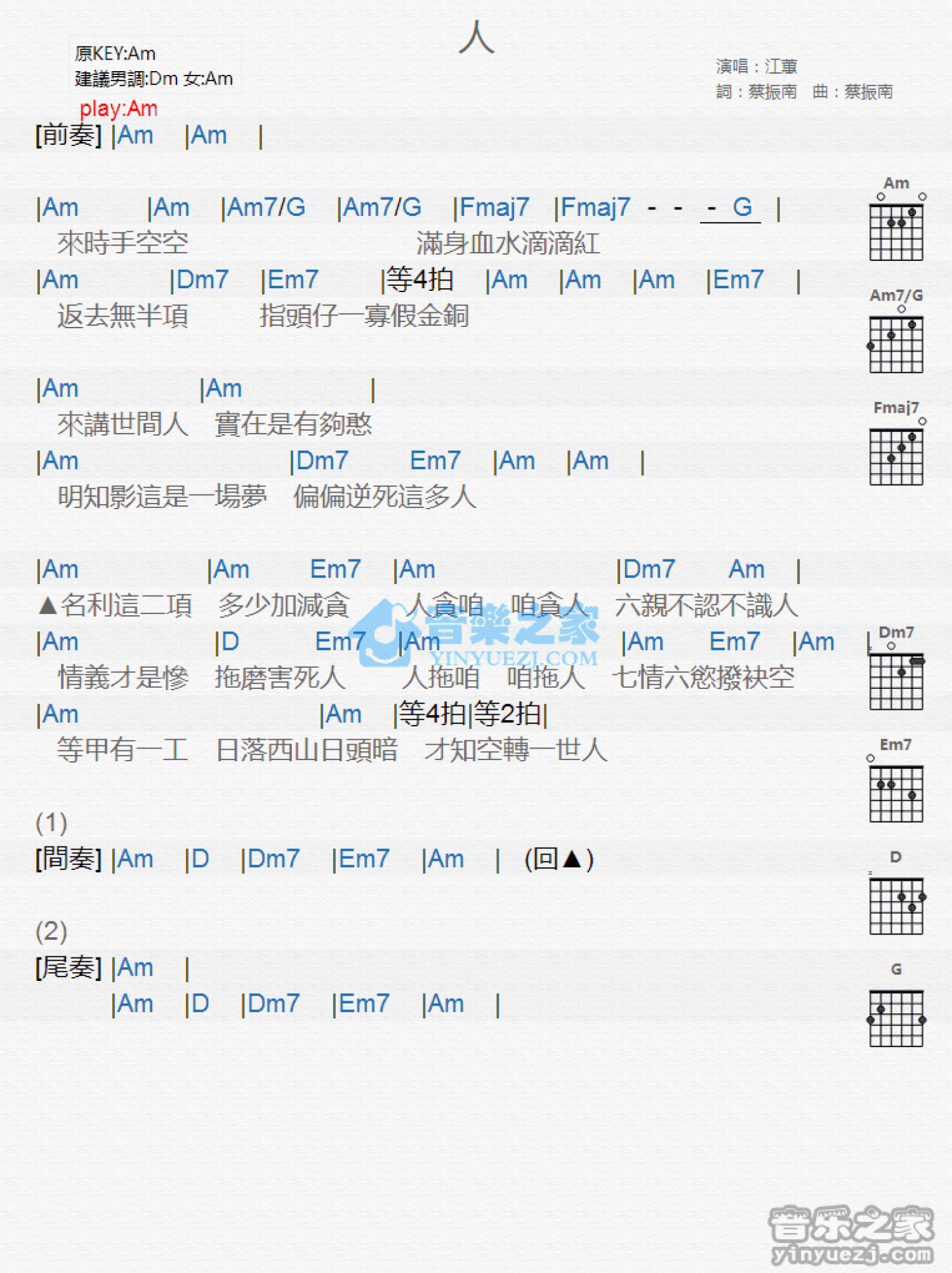 曲谱介绍: Am调版 江蕙《人》吉他和弦弹唱谱