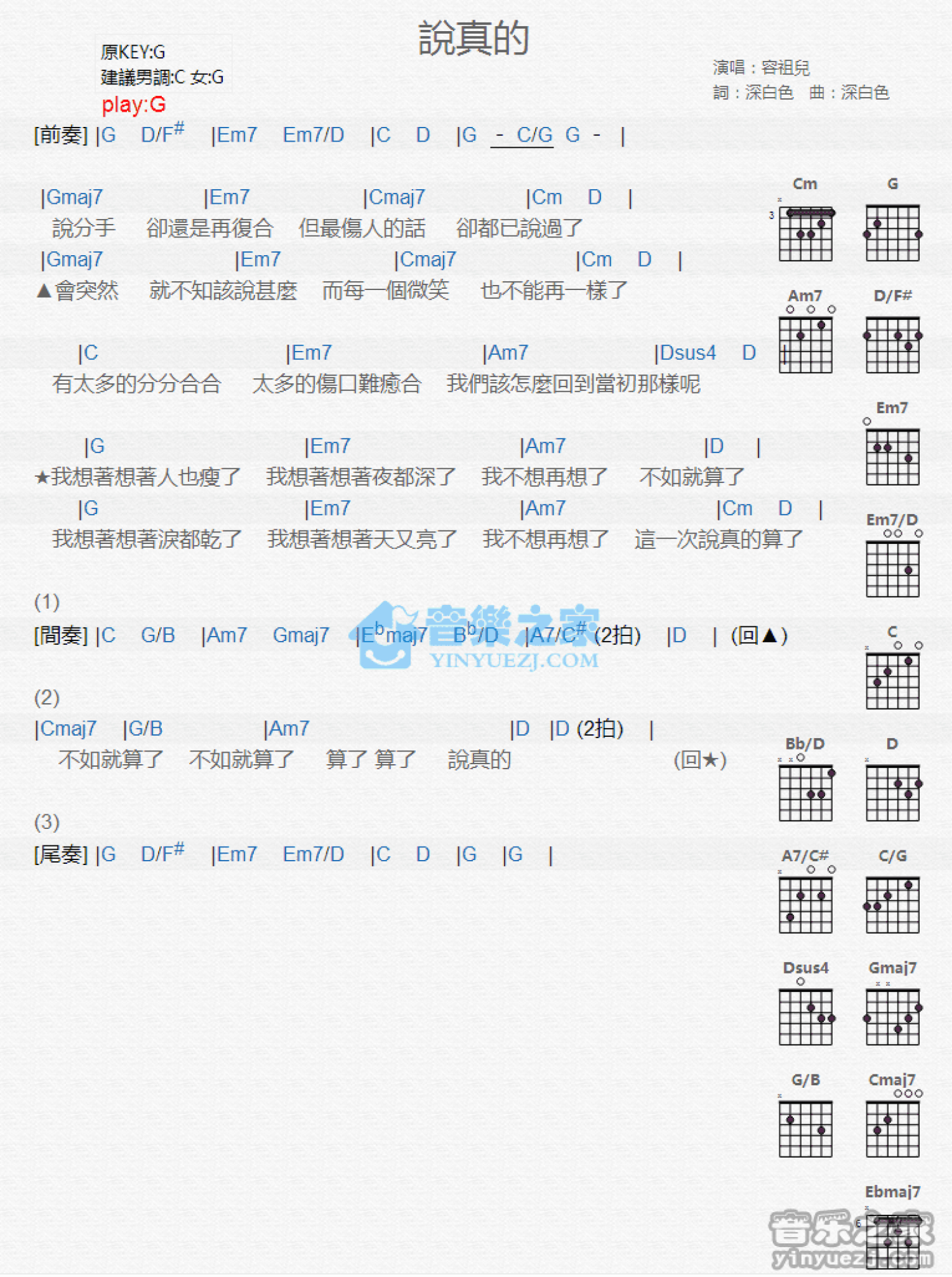曲谱介绍: G调版 容祖儿《说真的》吉他和弦弹唱谱