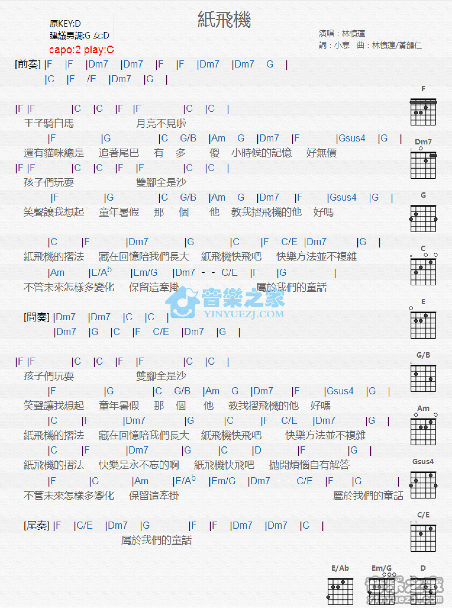 曲谱介绍: C调版《纸飞机》吉他和弦弹唱谱