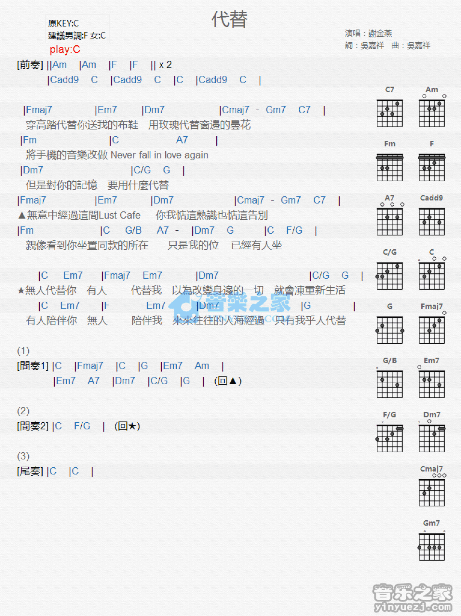 曲谱介绍: C调版《代替》吉他和弦弹唱谱