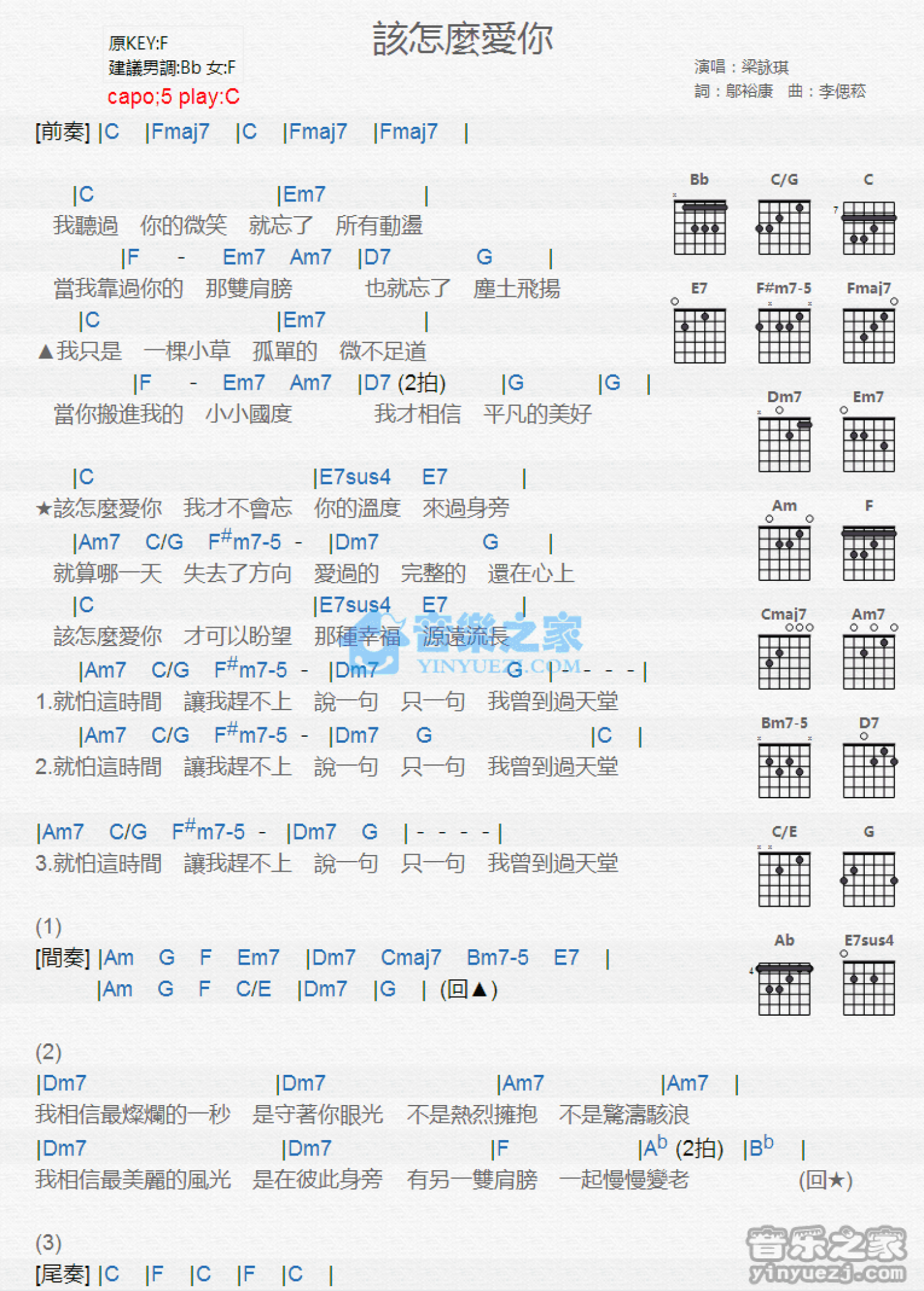曲谱介绍: C调版《该怎么爱你》吉他和弦弹唱谱