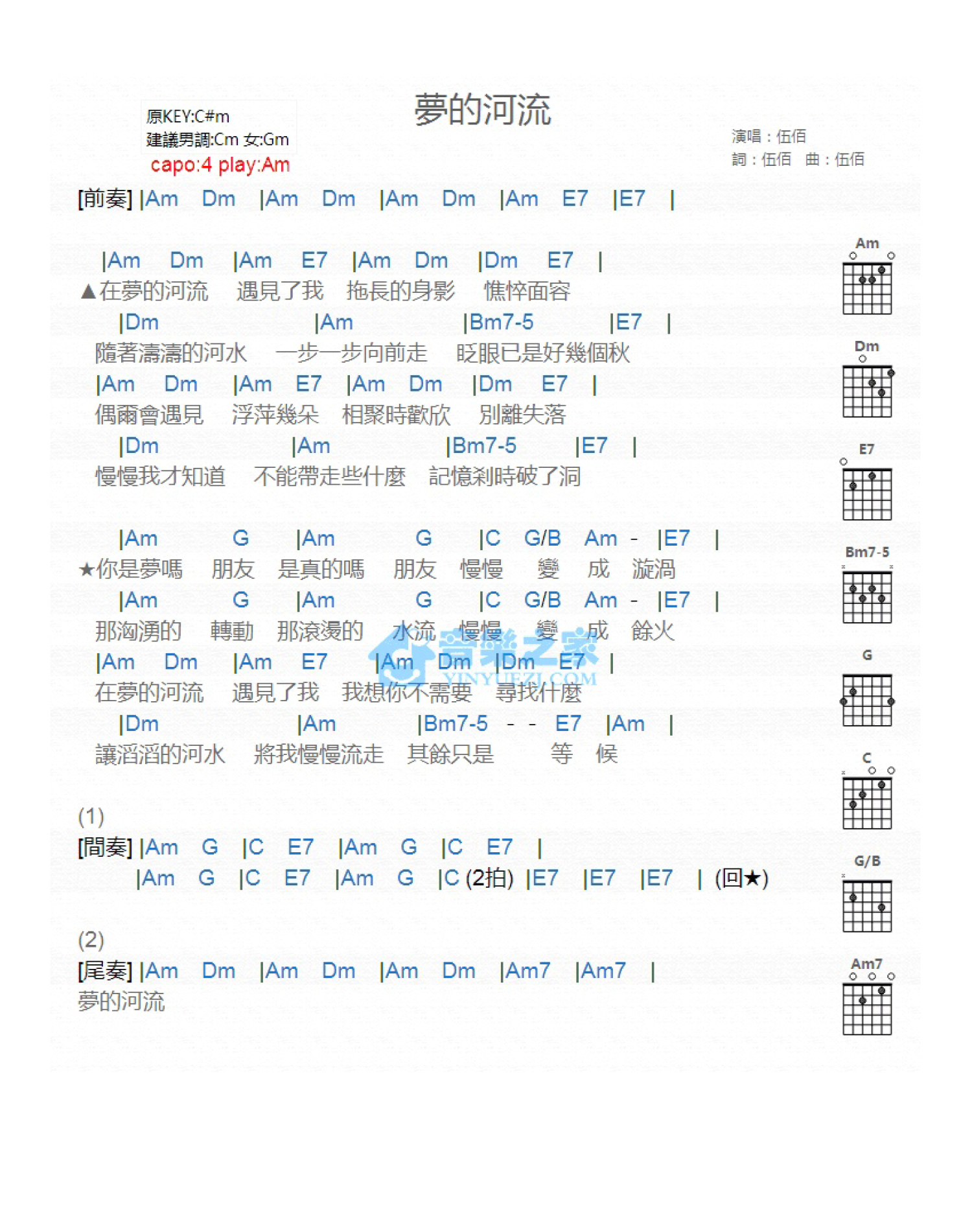 曲谱介绍: Am调版《梦的河流》吉他和弦弹唱谱