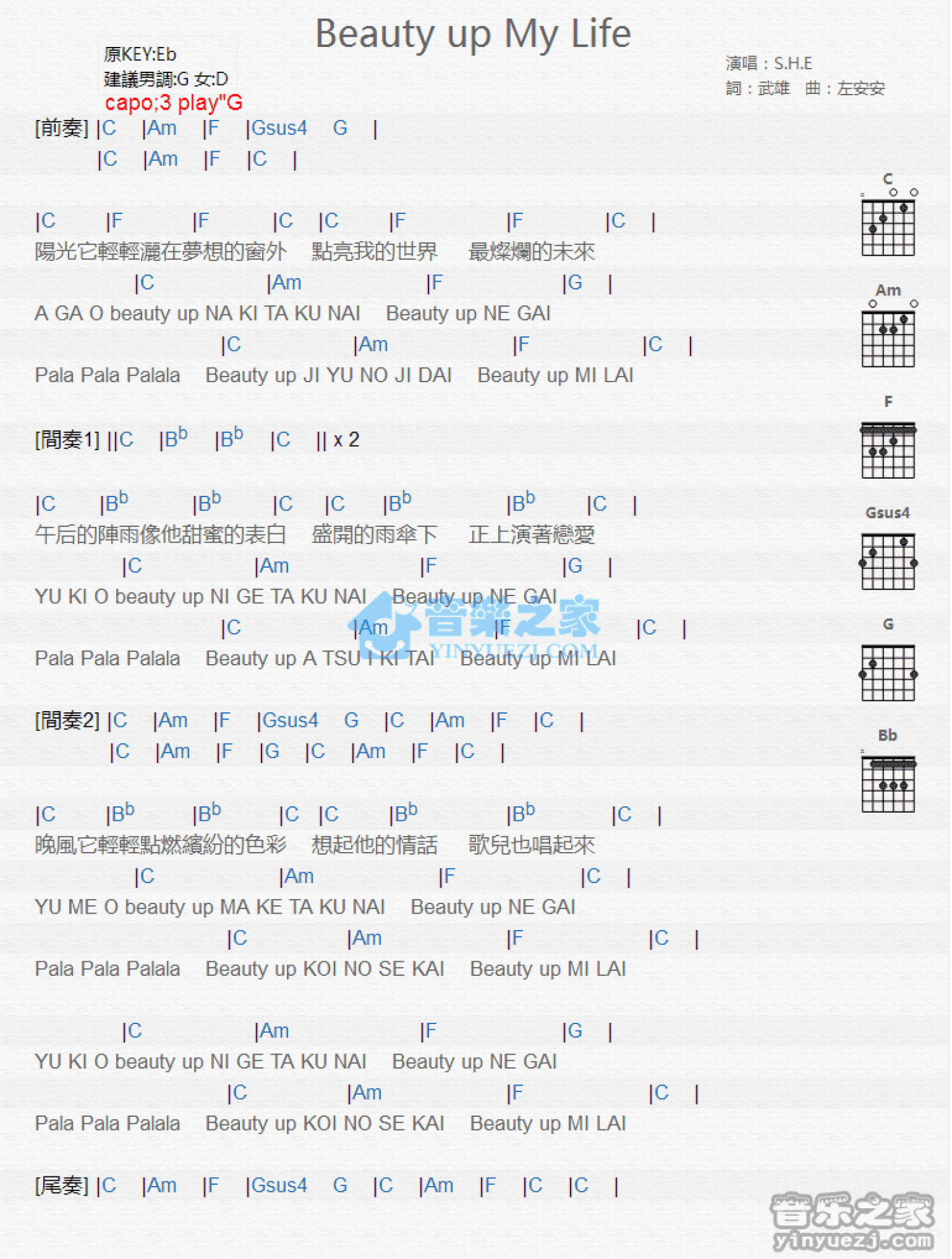 曲谱介绍: G调版《BeautyUpMyLife》吉他和弦弹唱谱