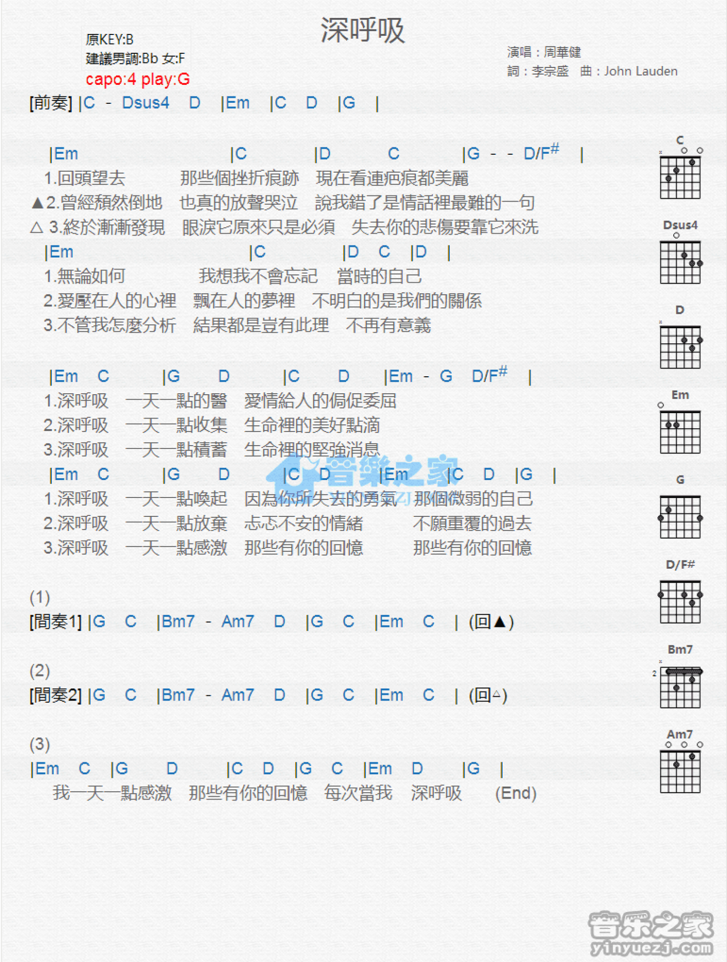 曲谱介绍: G调版《深呼吸》吉他和弦弹唱谱