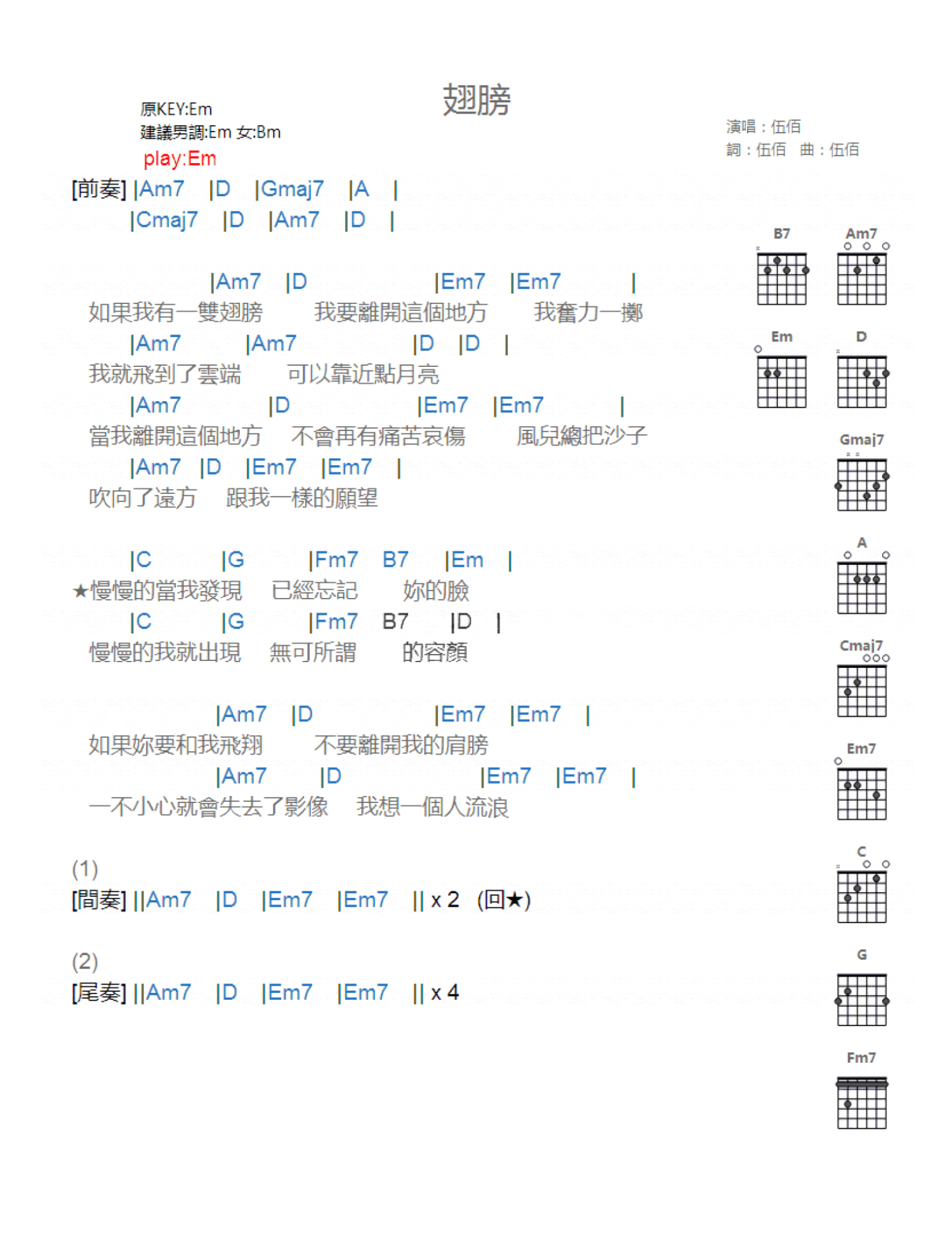 曲谱介绍: Em调版《翅膀》吉他和弦弹唱谱