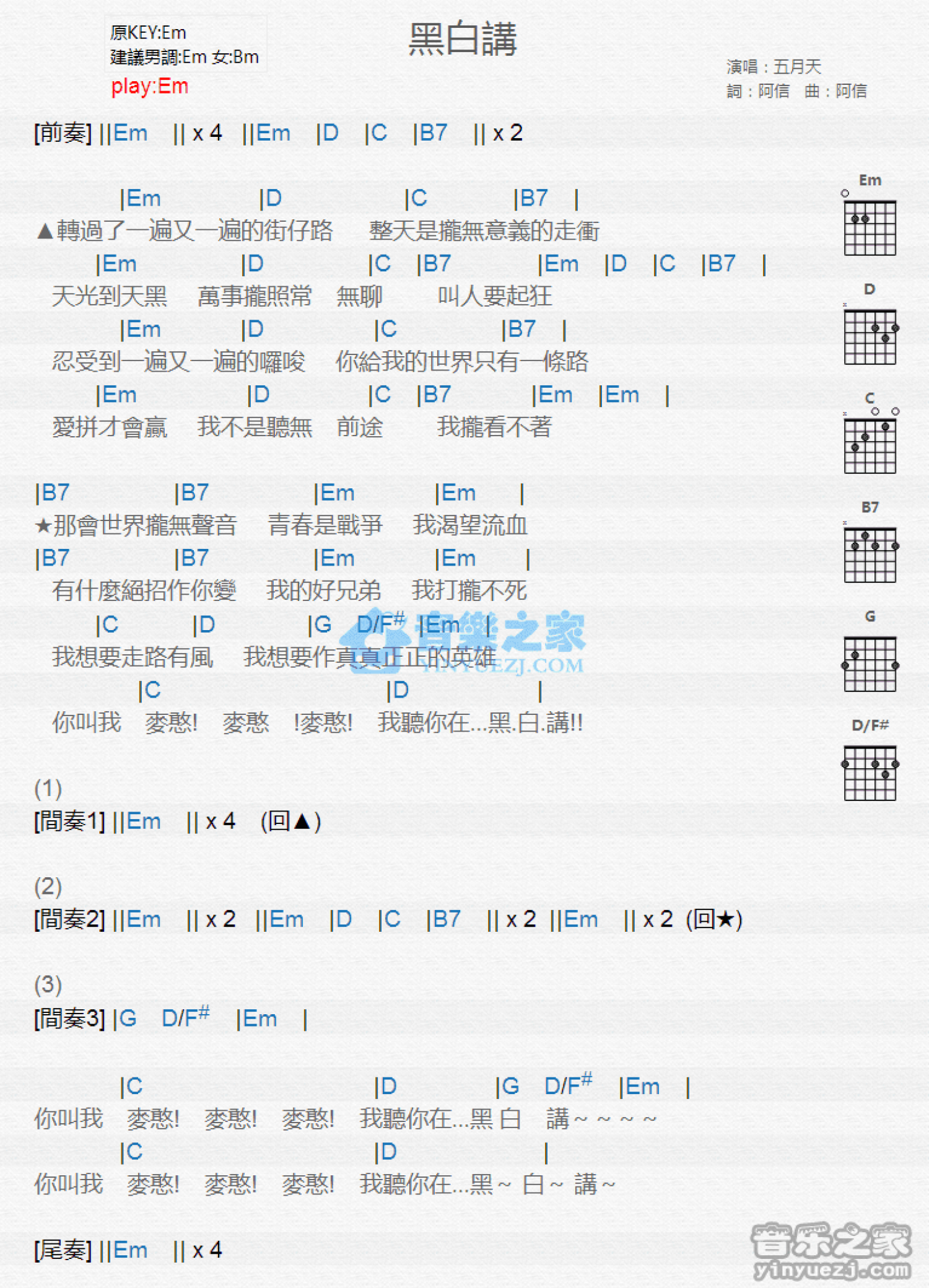 曲谱介绍: Em调版《黑白讲》吉他和弦弹唱谱