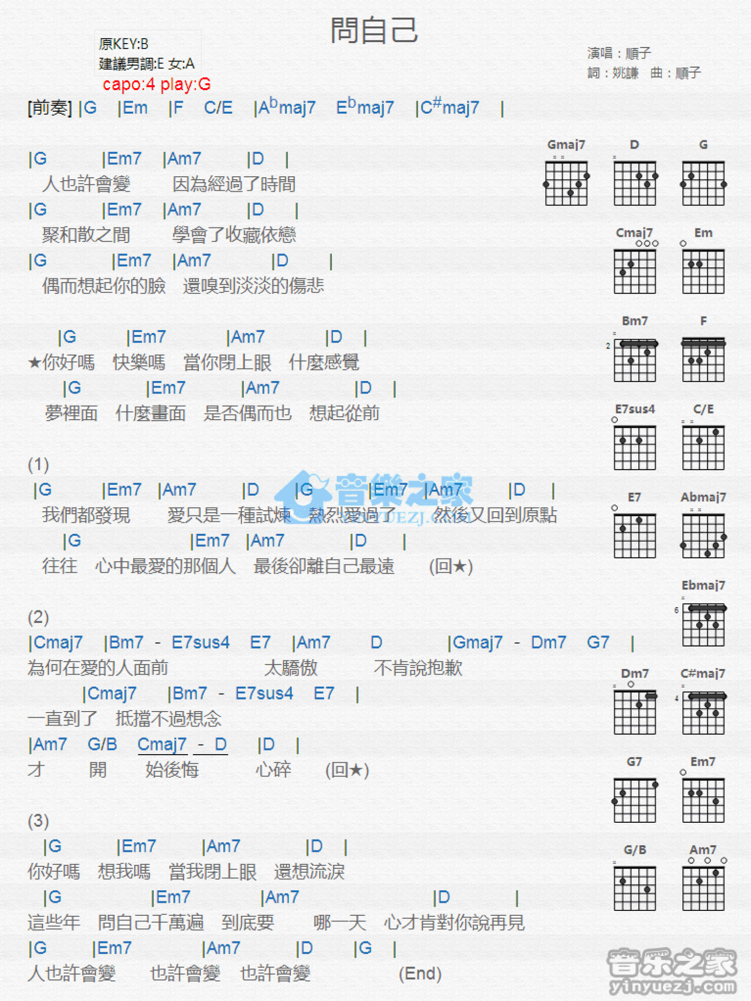 问自己吉他谱 - 顺子 - G调吉他弹唱谱 - 和弦谱