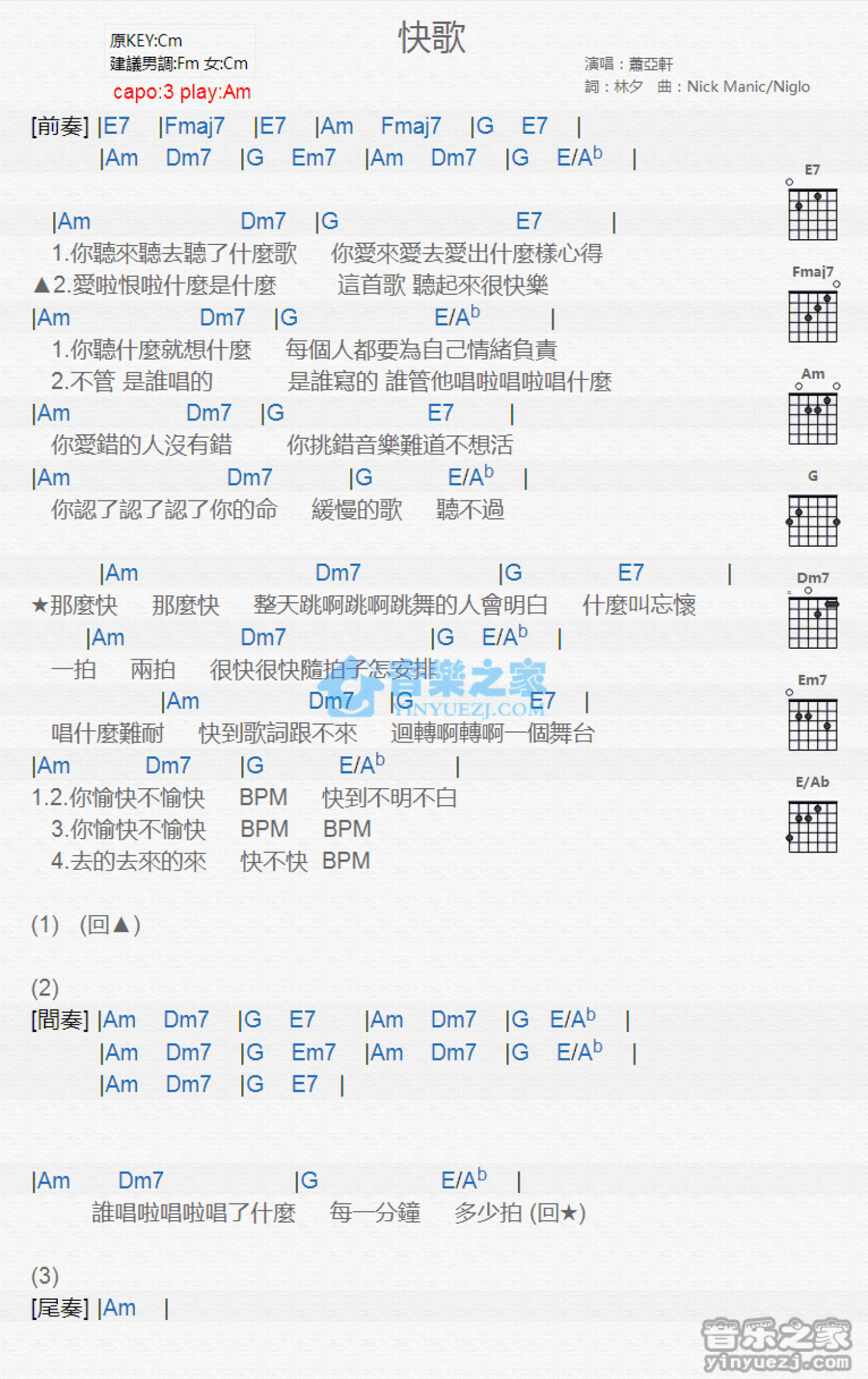 曲谱介绍: Am调版《快歌》吉他和弦弹唱谱