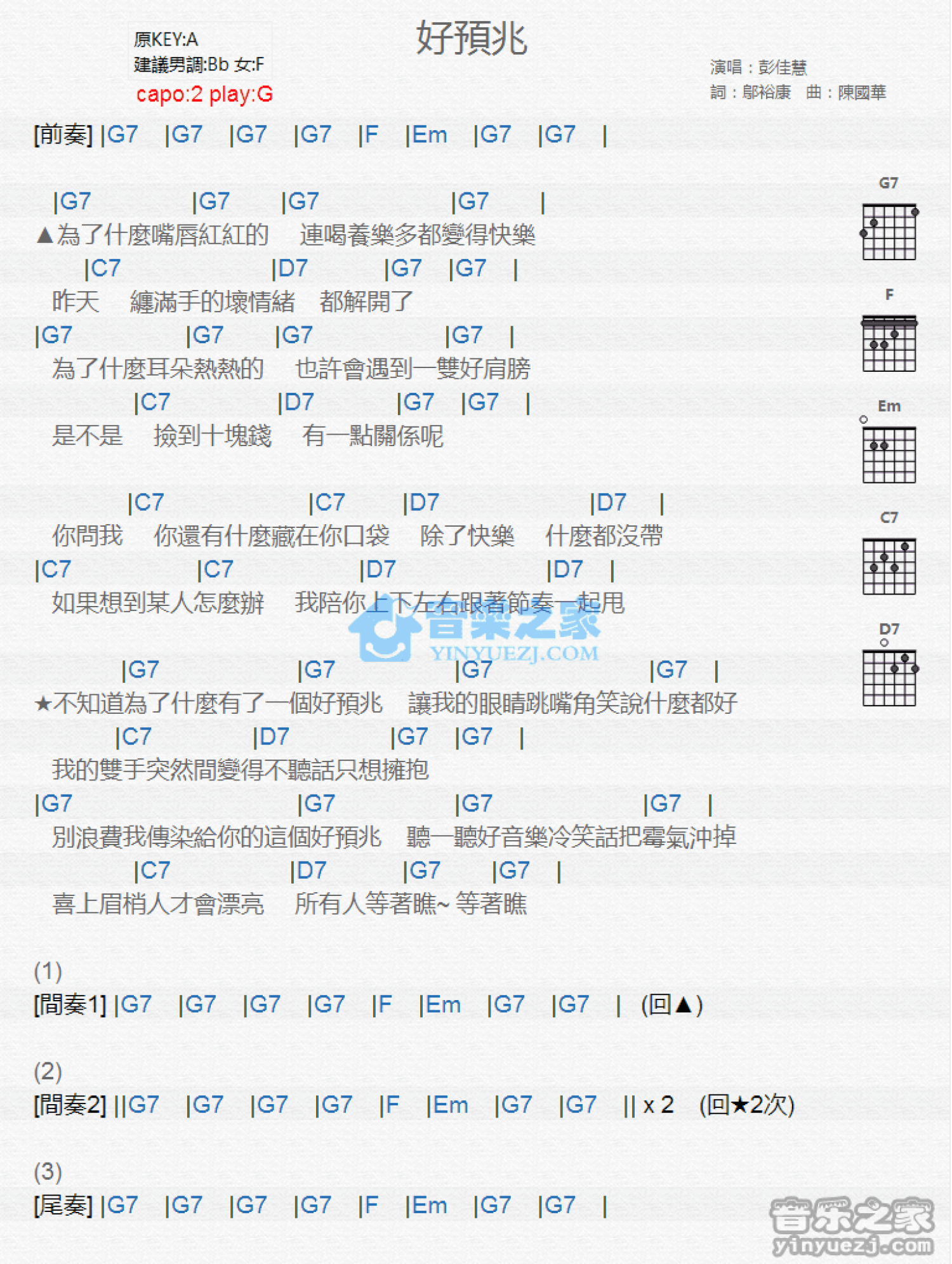 曲谱介绍: G调版《好预兆》吉他和弦弹唱谱