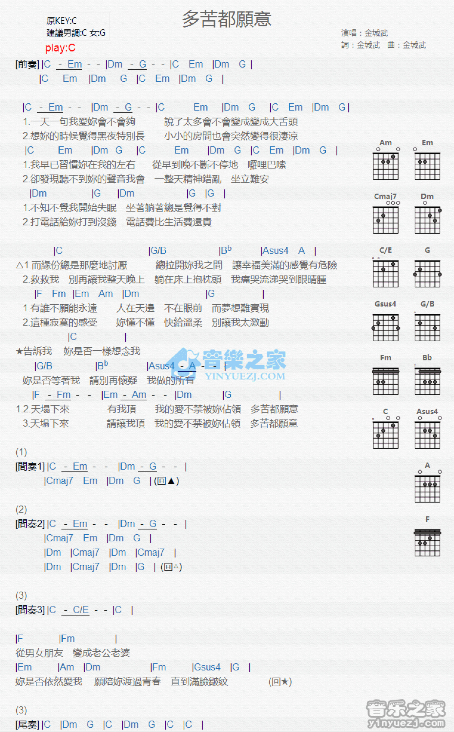 曲谱介绍: C调版《多苦都愿意》吉他和弦弹唱谱