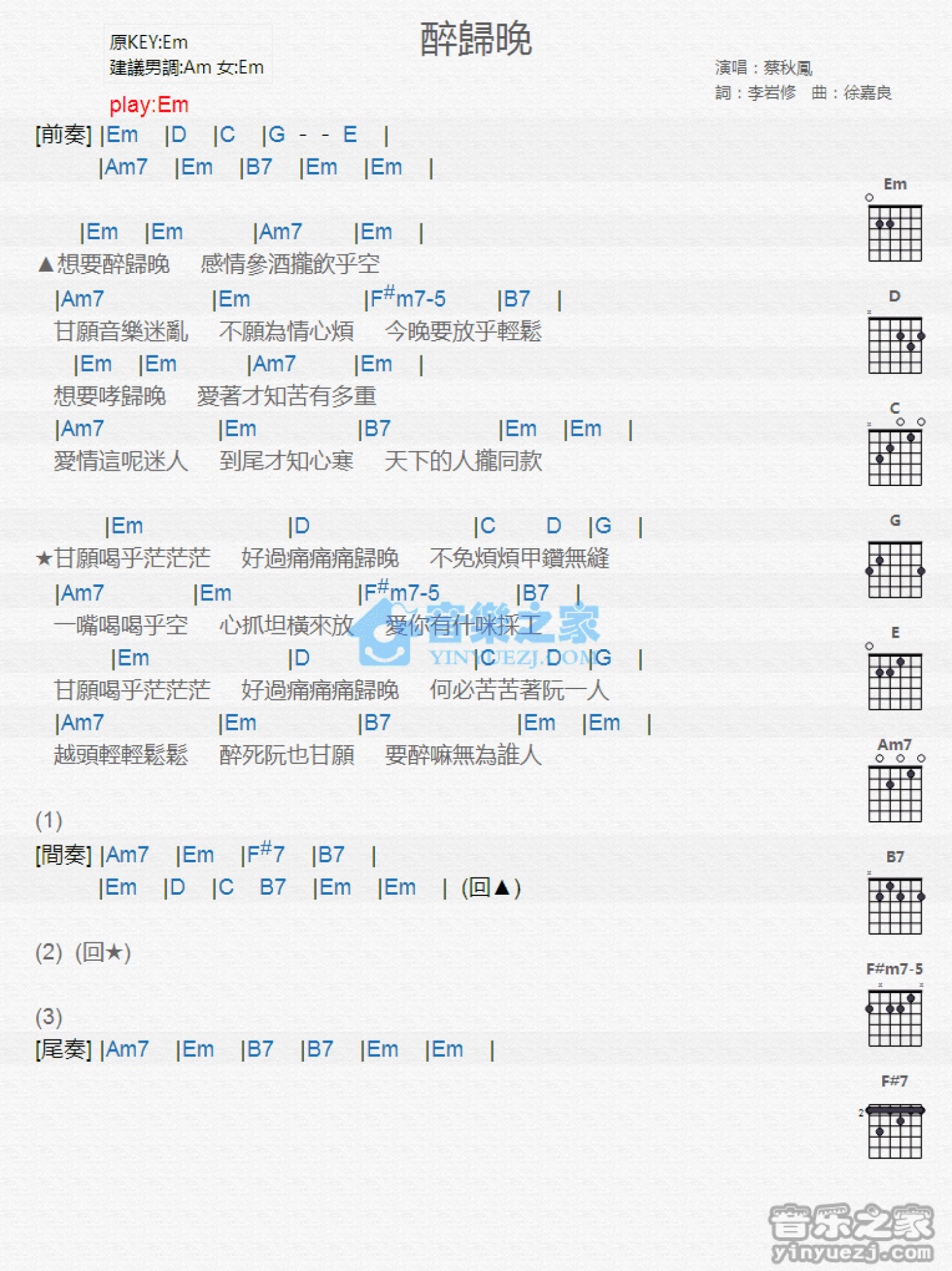 曲谱介绍: Em调版《醉归晚》吉他和弦弹唱谱