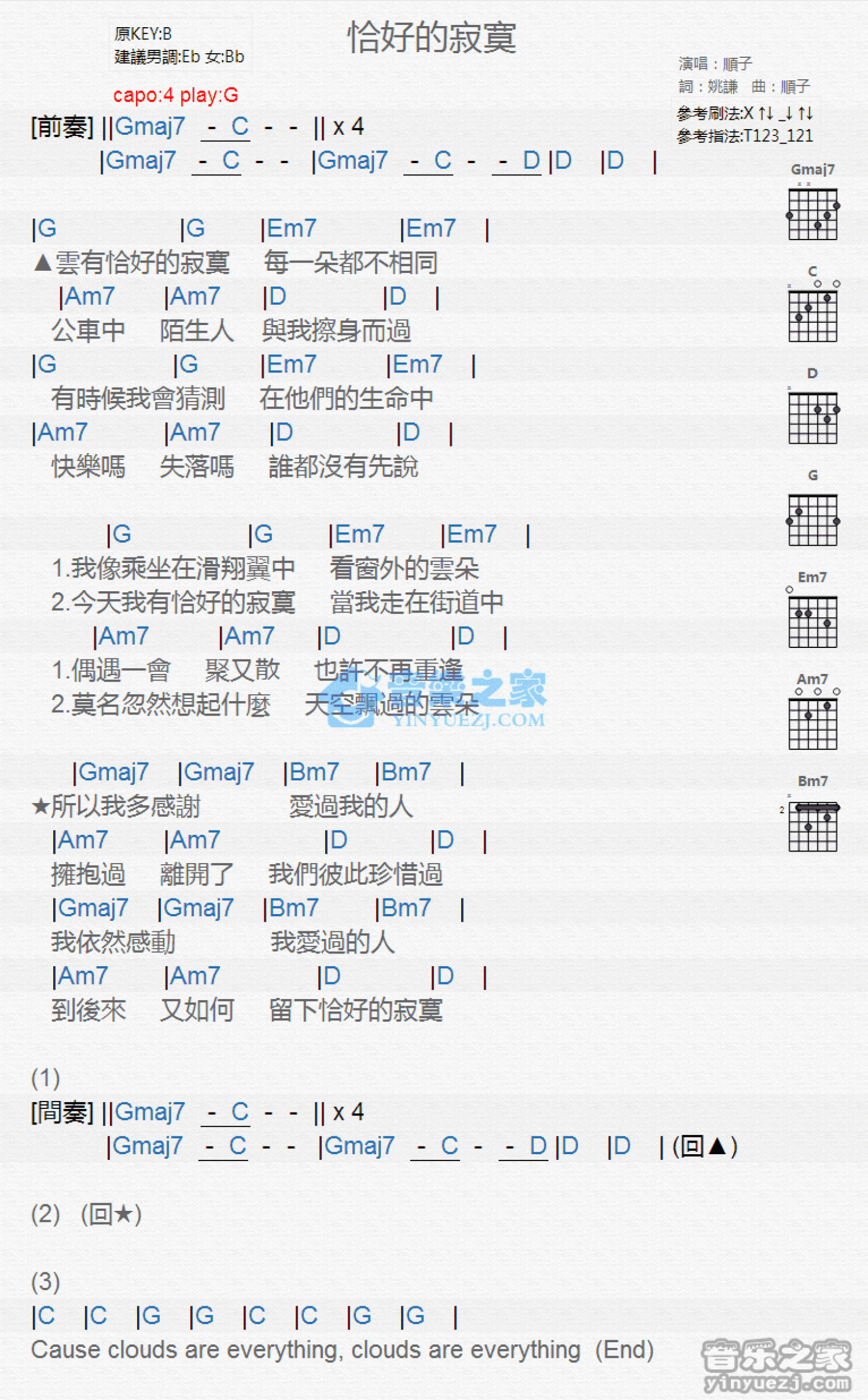 曲谱介绍: G调版 顺子《恰好的寂寞》吉他和弦弹唱谱