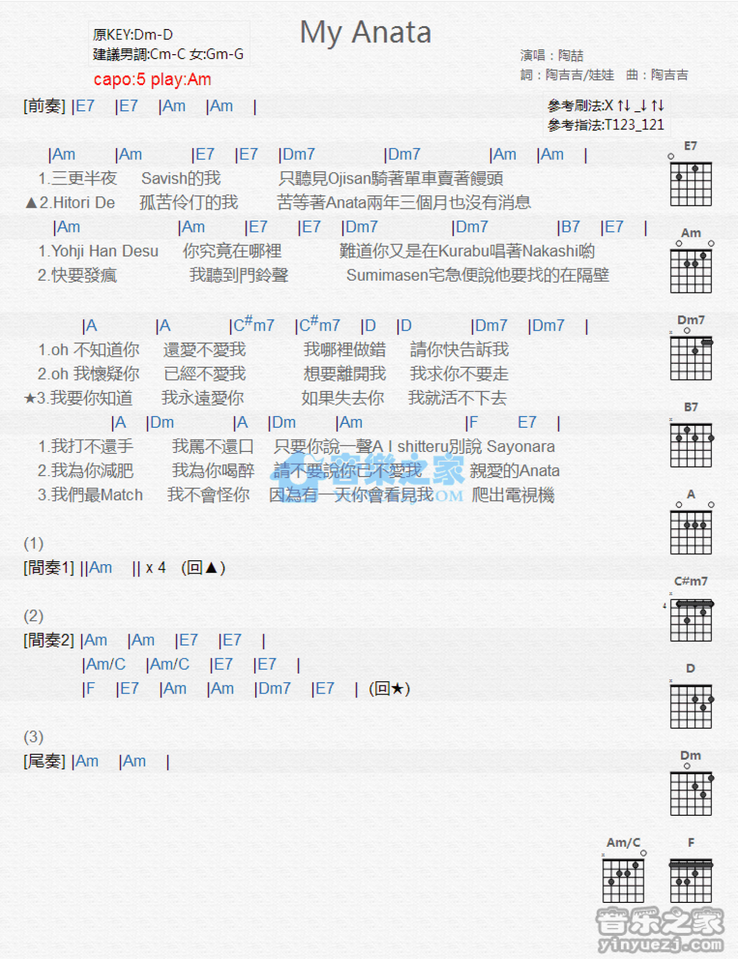 曲谱介绍: Am调版 陶础My Anata》吉他和弦弹唱谱