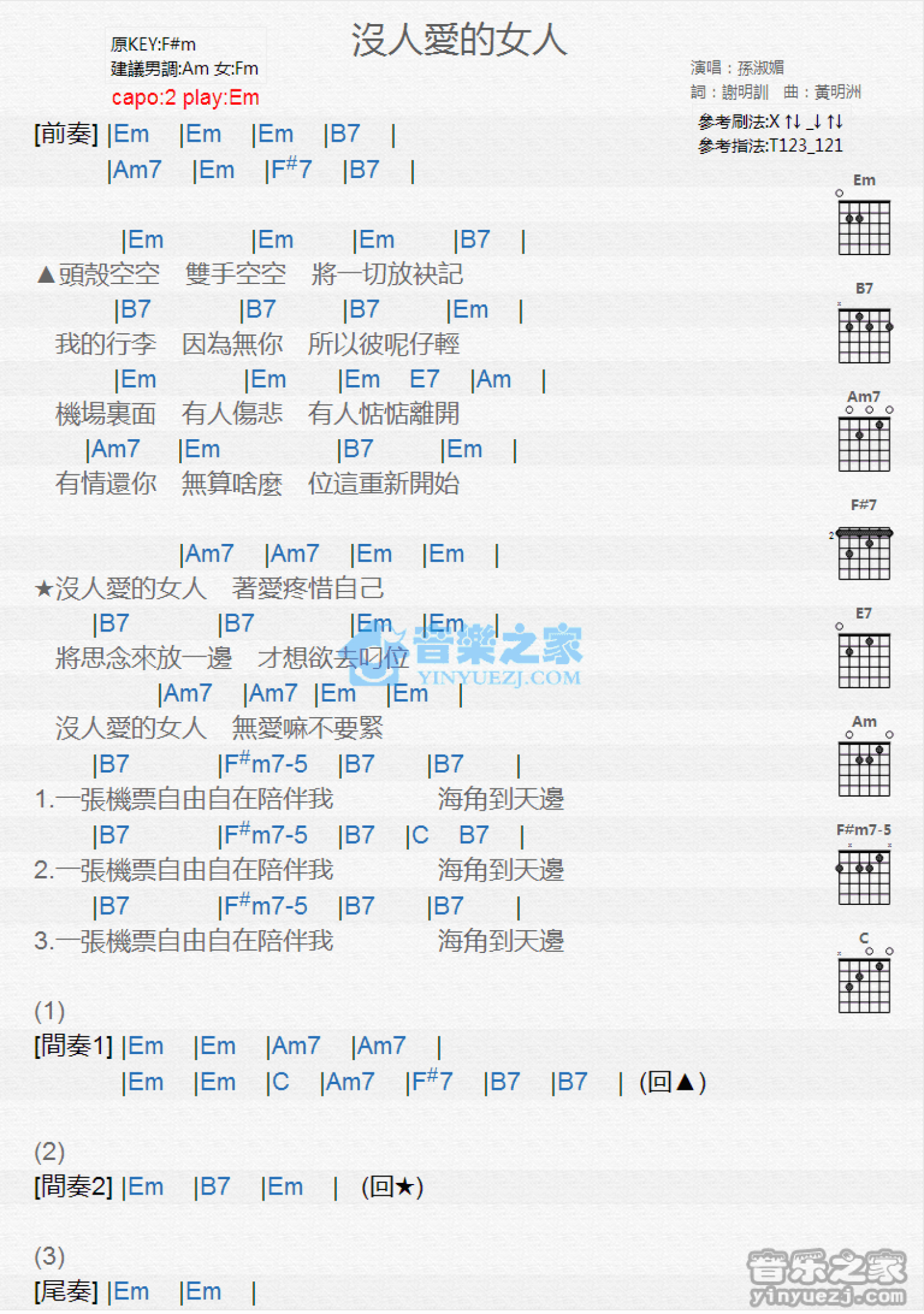 曲谱介绍: Em调版 孙淑媚《没人爱的女人》吉他和弦弹唱谱