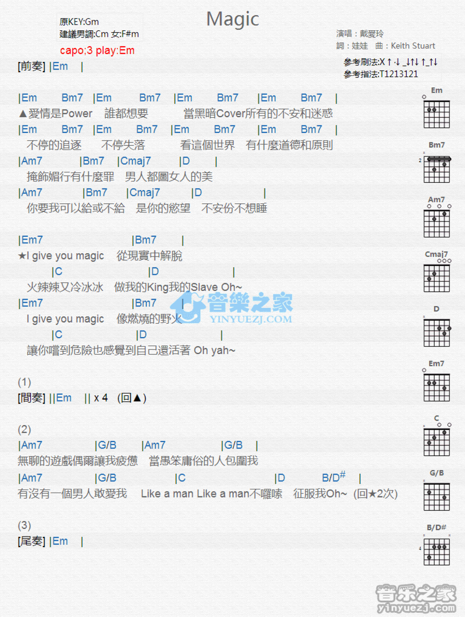 曲谱介绍: Em调版 戴爱玲《Magic》吉他和弦弹唱谱