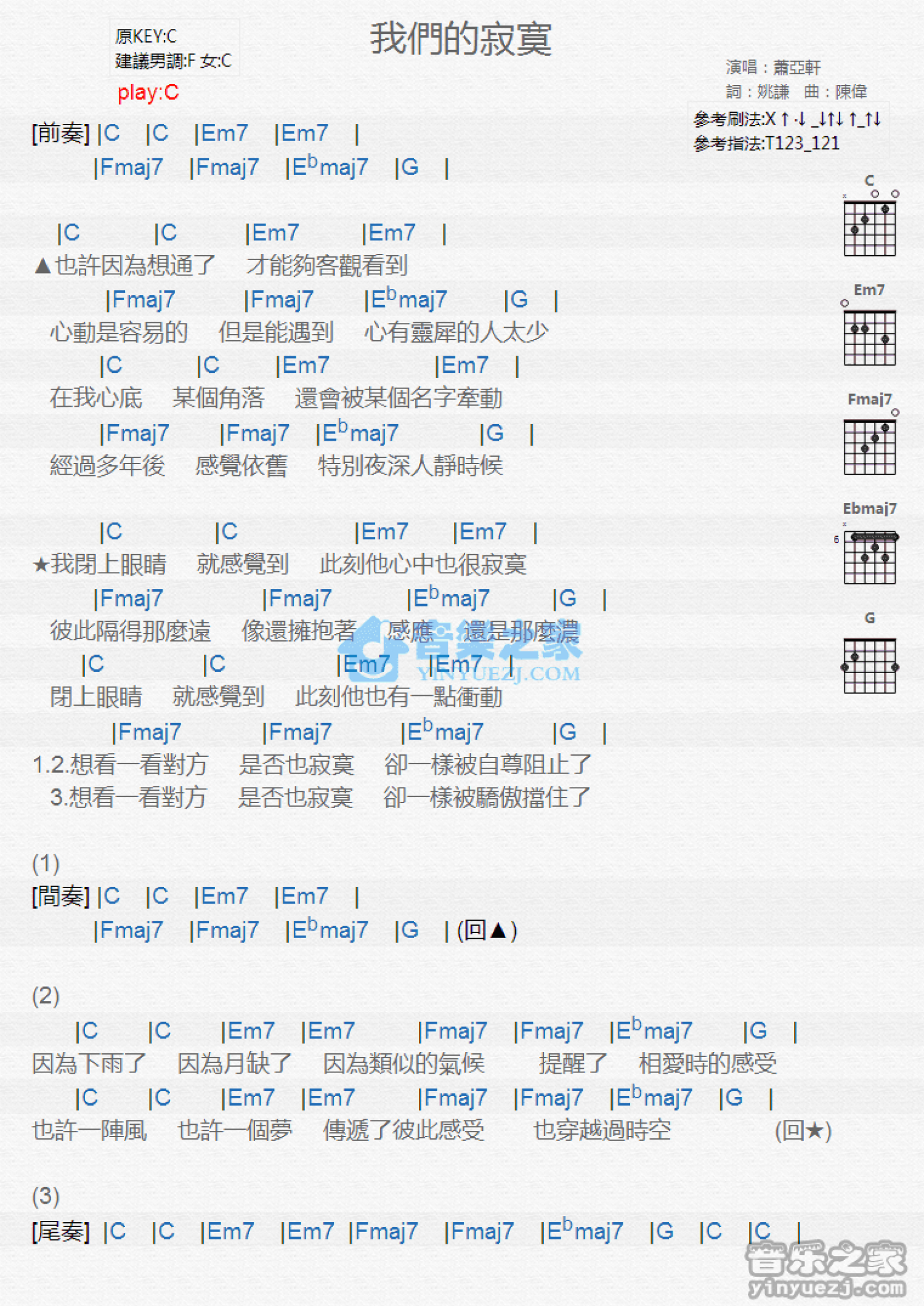 曲谱介绍: C调版 萧亚轩《我们的寂寞》吉他和弦弹唱谱