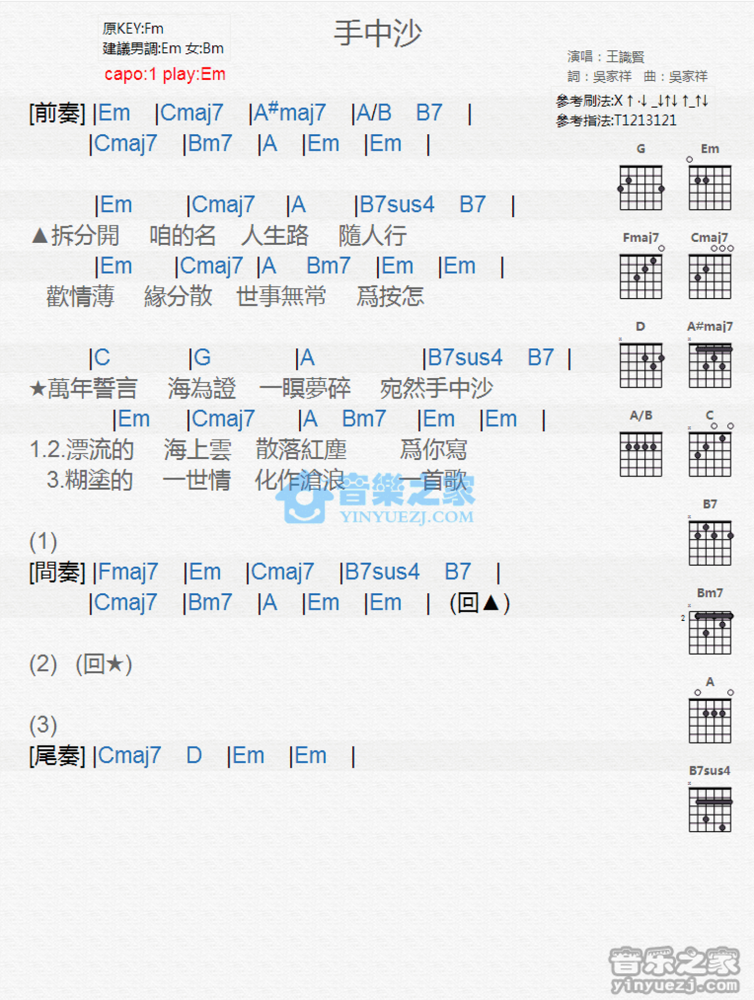 曲谱介绍: Em调版 王识贤《手中沙》吉他和弦弹唱谱