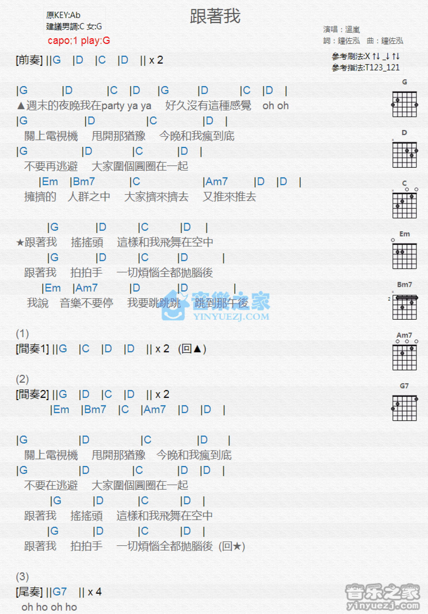 曲谱介绍: G调版 温岚《跟着我》吉他和弦弹唱谱