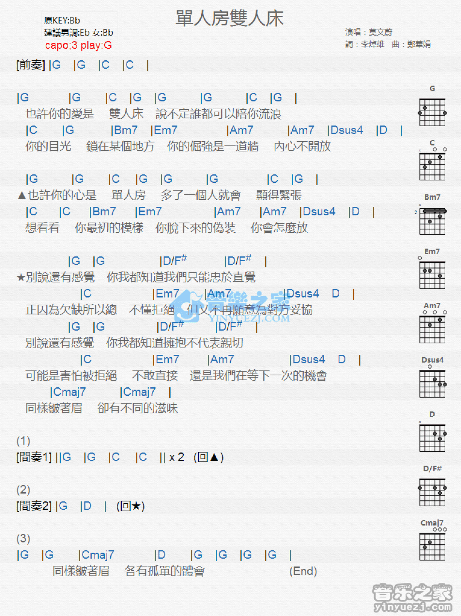 曲谱介绍: G调版 莫文蔚《单人房双人床》吉他和弦弹唱谱